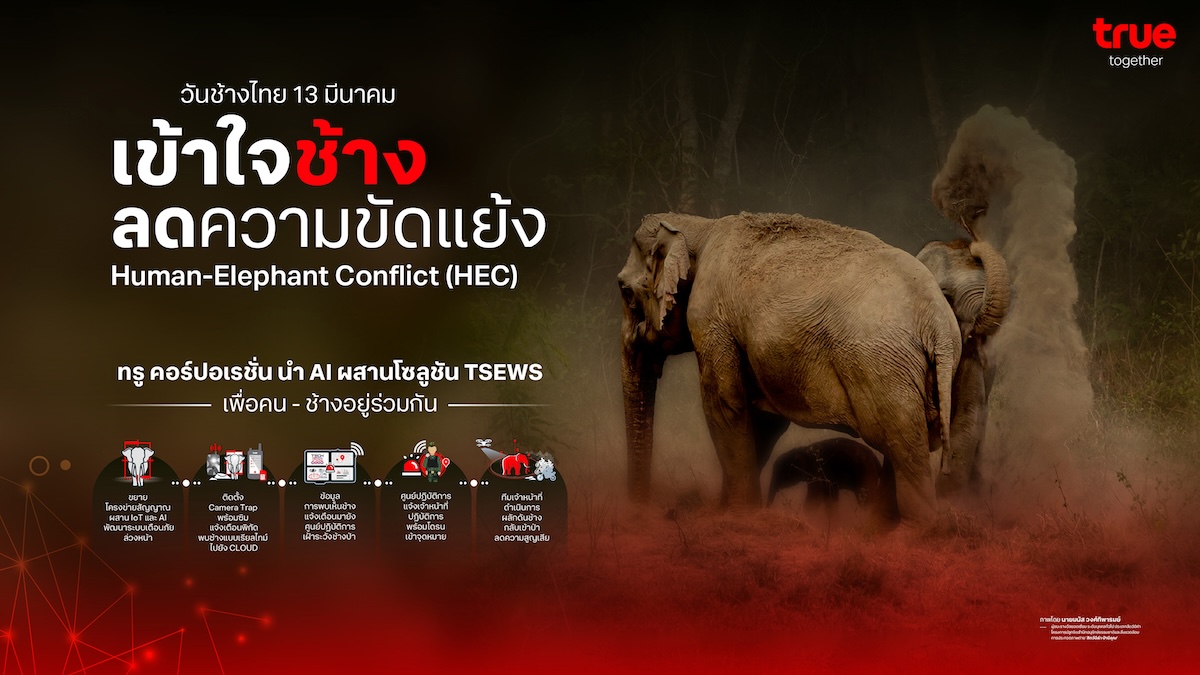 วันช้างไทย 13 มีนาคม ทรู คอร์ปอเรชั่นนำ AI ผสานโซลูชัน TSEWS เพิ่มความแม่นยำ ระบบ เข้าใจช้าง ลดความขัดแย้ง ส่งเสริมการอยู่ร่วมกันของคนและช้างป่า ในโลกที่พื้นที่ธรรมชาตินับวันจะลดลงเรื่อยๆ