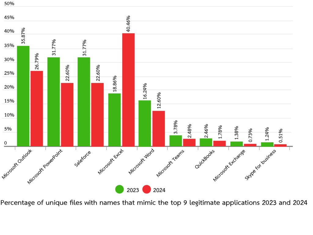 Microsoft Excel กลับมาครองตำแหน่งช่องทางการโจมตีอันดับหนึ่ง โดยย้ายจากอันดับที่สี่มาอยู่ที่อันดับหนึ่งระหว่างปี 2566 ถึง 2567 Microsoft Word คว้าอันดับที่สอง ในขณะที่ Microsoft PowerPoint และ Salesforce เป็นแอปพลิเคชันที่ถูกกำหนดเป็นเป้าหมายมากที่สุดเป็นอันดับสาม
