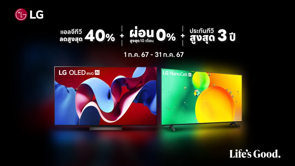 พิเศษ! ทางแอลจีจัดโปรโมชันลดราคาทีวีสูงสุด 40% ผ่อน 0% นานสูงสุด 10 เดือน พร้อมรับประกันสูงสุด 3 ปี โดยมีทีวีรุ่นที่ร่วมรายการทั้ง OLED, QNED, NanoCell และ UHD