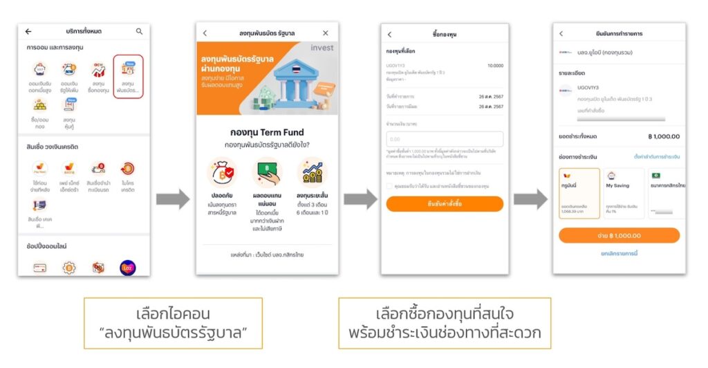 กองทุนพันธบัตรรัฐบาล (Term Fund) บน ทรูมันนี่ แบ่งเป็นการลงทุนระยะสั้น 3 เดือน 6 เดือน หรือ 1 ปี ซึ่งประมาณการผลตอบแทนคาดหวังสูงสุด 2.10% ต่อปี ขึ้นอยู่กับแต่ละกองทุน และค่าธรรมเนียมการซื้อ-ขายจะเทียบเท่ากับการซื้อตรงกับ บลจ. โดยกองทุนประเภทนี้เหมาะสำหรับผู้ที่เพิ่งเริ่มต้นลงทุน ผู้ที่รับความเสี่ยงได้ต่ำ และคาดหวังผลตอบแทนสูงกว่าเงินฝากประจำ หรือผู้ที่ยังไม่มีความจำเป็นต้องใช้เงินในช่วงอายุของกองทุน ที่สามารถลงทุนได้ จนครบกำหนดอายุโครงการ โดยสามารถเปิดบัญชีลงทุนได้ง่าย ๆ ผ่าน ทรูมันนี่ ไม่ต้องใช้เอกสารอื่น ๆ ให้ยุ่งยาก และเริ่มต้นลงทุนเพียง 1,000 บาท โดยสามารถซื้อกองทุนได้ทุกวัน ตลอด 24 ชั่วโมง และมีการอัปเดตกองทุนใหม่ ๆ ทุกสัปดาห์