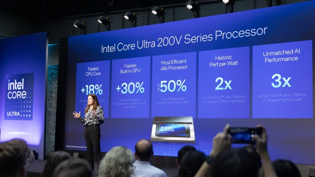 เหตุสำคัญที่ทำให้ Intel มั่นใจว่า Intel Core Ultra 200V ซีรีส์ จะออกมาพร้อมกับสถาปัตยกรรมกราฟิกแบบใหม่ Intel Xe2 ที่ให้ประสิทธิภาพเพิ่มขึ้น 50% รวมถึงมีหน่วยประมวลผล AI แยกออกมารองรับการใช้งานโดยเฉพาะ ในภาพรวมสามารถลดการใช้พลังงานลง 40% เมื่อเทียบกับรุ่นก่อนหน้า
