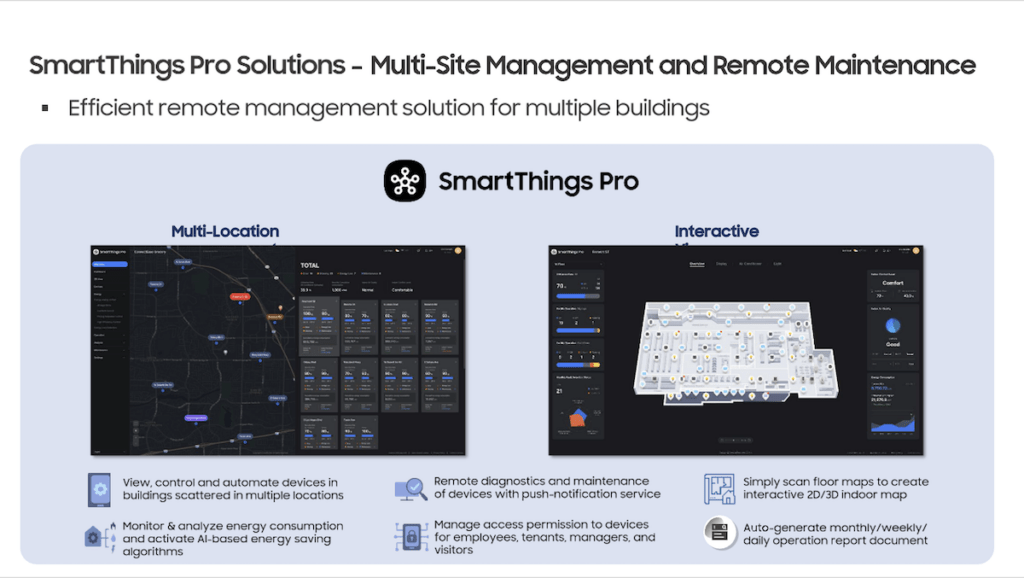 สำหรับ SmartThings Pro Solutions เป็นโซลูชันที่ได้รับการพัฒนาขึ้นเพื่อให้เจ้าของอาคารและผู้ดูแลระบบสามารถควบคุมและจัดการอุปกรณ์ต่างๆ ในอาคารได้จากที่ใดก็ได้ ผ่านหลากหลายช่องทาง ไม่ว่าจะเป็นแอปพลิเคชัน SmartThings App, เว็บอินเตอร์เฟส หรือแดชบอร์ดของระบบ SmartThings Pro Cloud โดยโซลูชันนี้ยังสามารถผสานรวมกับระบบ API ระดับองค์กร (Enterprise API) เพื่อเชื่อมต่อและควบคุมระบบของบุคคลที่สามได้อย่างง่ายดาย