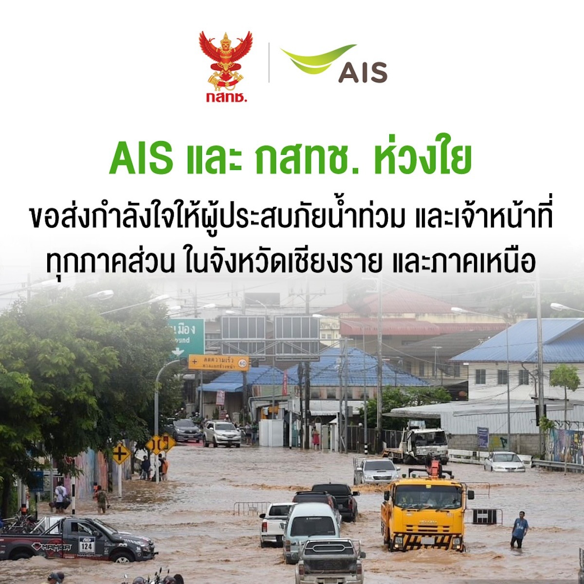 จากสถานการณ์น้ำท่วมที่เกิดขึ้นในพื้นที่ภาคเหนืออย่างต่อเนื่อง ส่งผลกระทบให้แก่ประชาชนในพื้นที่เป็นวงกว้าง AIS และ กสทช. มีความห่วงใยประชาชน รวมถึงเจ้าหน้าที่จากทุกหน่วยงานซึ่งกำลังช่วยเหลือผู้ประสบภัยในขณะนี้ โดยพร้อมอยู่เคียงข้างดูแลจนกว่าสถานการณ์จะเข้าสู่สภาวะปกติ