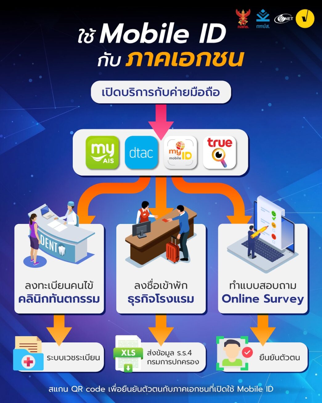 6.เริ่มใช้งาน – หลังจากการสมัครเรียบร้อยแล้ว คุณสามารถเริ่มใช้งาน Mobile ID ได้ทันที ,โดยการแสดง QR Code หรือรหัสยืนยันตัวตนผ่านแอปพลิเคชันของผู้ให้บริการเครือข่าย