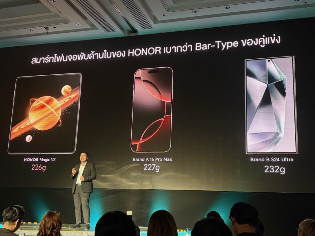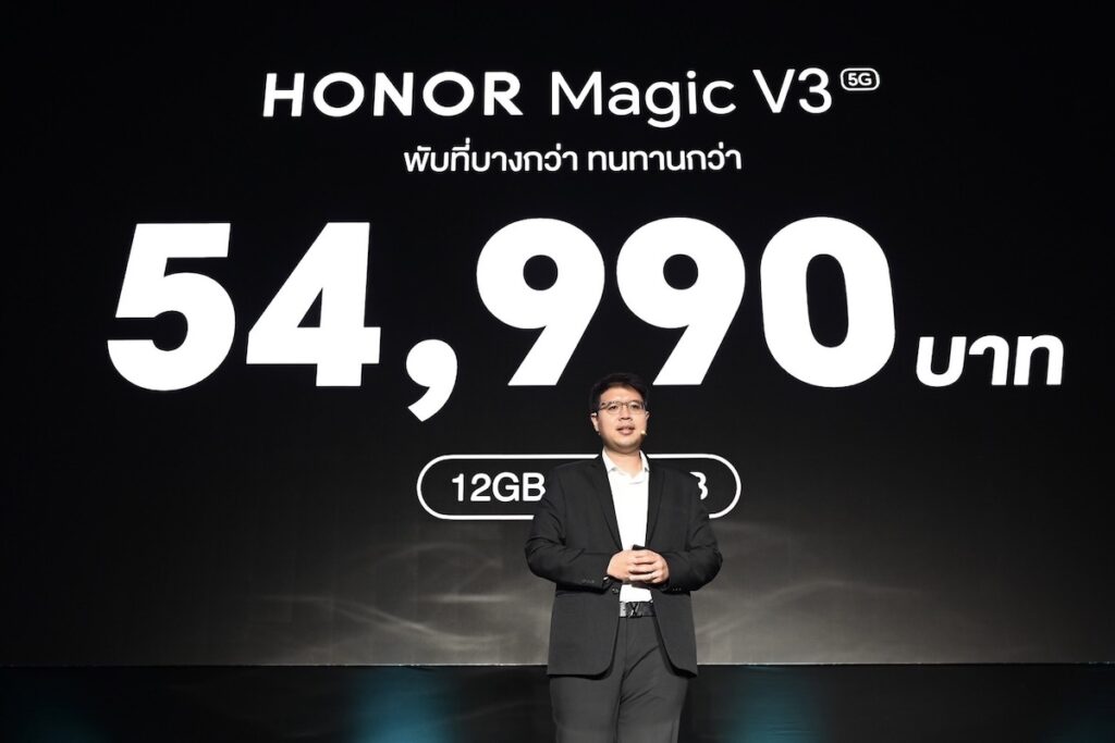 พลภัทร์ สายบัวทอง ประธานเจ้าหน้าที่ฝ่ายปฏิบัติการณ์ บริษัท ออเนอร์ ประเทศไืทย กล่าวว่า HONOR Magic V3 ได้รับการพัฒนาขึ้นตามแนวคิด Human-centric ที่มุ่งเน้นความต้องการของผู้ใช้ ไฮไลต์หลักอยู่ที่ความบางและเบาที่สุดในโลก พร้อมนวัตกรรมแบตเตอรี่ขนาดเล็กแต่ทรงพลัง ด้วยความบางและเบา บางเพียง 9.2 มิลลิเมตร ขณะพับจอ และ 4.35 มิลลิเมตร เมื่อกางหน้าจอออก น้ำหนักเบาเพียง 226 กรัม ซึ่งทำลายสถิติสมาร์ทโฟนพับได้รุ่นก่อนหน้าอย่าง HONOR Magic V2