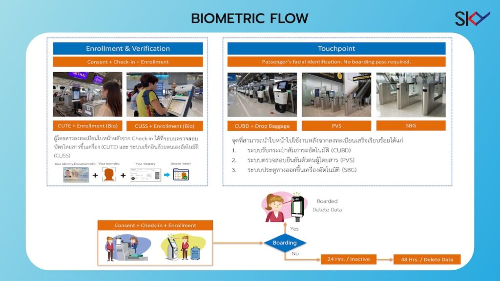 สิทธิเดช มัยลาภ ประธานเจ้าหน้าที่บริหาร บริษัท สกาย ไอซีที จำกัด (มหาชน) หรือ สกาย กรุ๊ป (SKY Group) กล่าวว่า บริษัท สกาย ไอซีที จำกัด (มหาชน) ในฐานะผู้ให้บริการเทคโนโลยีด้านอุตสาหกรรมการบินชั้นนำของประเทศไทย นำระบบพิสูจน์อัตลักษณ์บุคคล (Automated Biometric Identification System: Biometric) หรือ ระบบข้อมูลชีวมาตร คือการพิสูจน์อัตลักษณ์บุคคลโดยใช้การสแกนใบหน้าเพื่อเข้าสู่ระบบสนามบิน ซึ่งเทคโนโลยีนี้สามารถนำมาใช้ในการยืนยันตัวตนของผู้โดยสารในสนามบินได้อย่างมีประสิทธิภาพและรวดเร็ว เทคโนโลยี Biometrics นี้จะเริ่มให้บริการกับผู้โดยสารภายในประเทศก่อนในวันที่ 1 พฤศจิกายน 2567 และพร้อมใช้งานสำหรับผู้โดยสารระหว่างประเทศในวันที่ 1 ธันวาคม 2567 ภายในท่าอากาศยานทั้ง 6 แห่งของ AOT ได้แก่ ท่าอากาศยานสุวรรณภูมิ ท่าอากาศยานดอนเมือง ท่าอากาศยานเชียงใหม่ ท่าอากาศยานแม่ฟ้าหลวง เชียงราย ท่าอากาศยานภูเก็ต และ ท่าอากาศยานหาดใหญ่