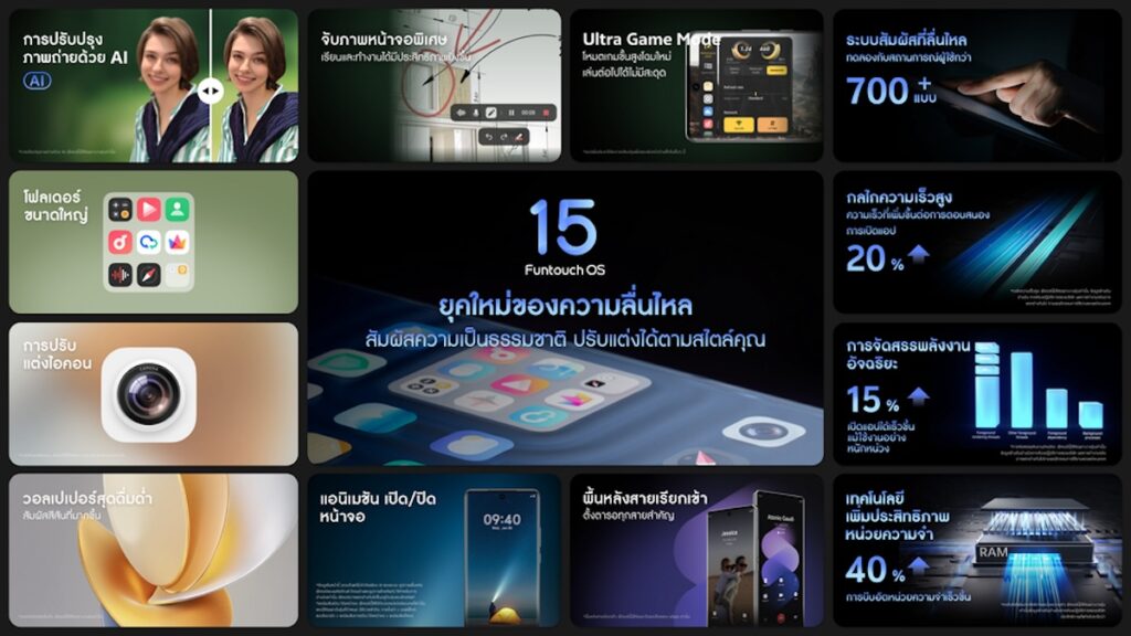 vivo ในฐานะผู้นำด้านเทคโนโลยีระดับโลก เข้าใจถึงความต้องการนี้ จึงได้สร้างความตื่นเต้นครั้งใหม่ให้กับผู้ใช้งานด้วยการเปิดตัว Funtouch OS 15 ระบบปฏิบัติการที่ทำงานบน Android 15 ได้อย่างลื่นไหลและมีประสิทธิภาพ พร้อมตัวเลือกการปรับแต่งที่หลากหลาย ฟีเจอร์อันครบครัน และนวัตกรรม AI อัจฉริยะ สำหรับทั้งการแต่งภาพ การเล่นเกม และเชื่อมต่อโลกดิจิทัลอย่างไร้ขอบเขต เรียกได้ว่านี่คือการก้าวข้ามขีดจำกัดสำคัญในการเปิดประตูสู่ยุคใหม่ที่สมาร์ตโฟนจะไม่เป็นเพียงเครื่องมืออิเล็กทรอนิกส์ธรรมดา แต่ยังเป็นผู้ช่วยอัจฉริยะที่ทำให้ชีวิตประจำวันของผู้ใช้งานง่ายขึ้นอีกด้วย!