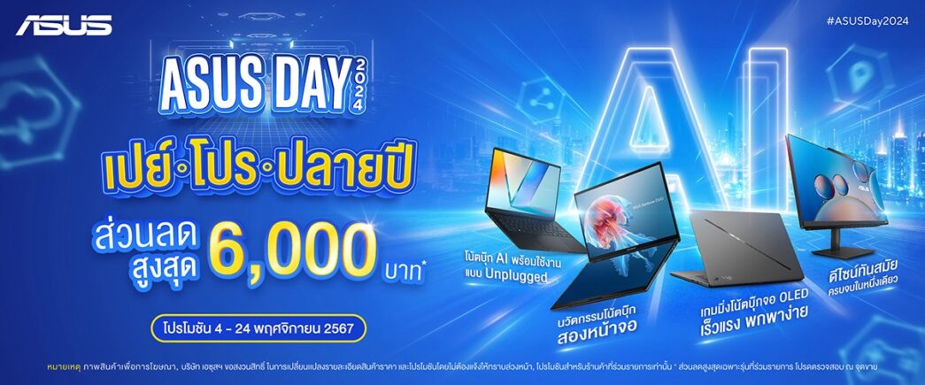 เอซุส (ประเทศไทย) และ รีพับบลิค ออฟ เกมเมอร์ส (ROG) จัดเต็มโปรโมชันปลายปี ASUS Day 2024 มอบส่วนลดโน้ตบุ๊ก, เกมมิ่งโน้ตบุ๊ก, ครีเอเตอร์โน้ตบุ๊ก, คอมพิวเตอร์เดสก์ท็อป และคอมพิวเตอร์ออลอินวัน (all-in-one)ที่ร่วมรายการสูงสุด 6,000 บาทตั้งแต่วันนี้ – 24 พฤศจิกายน 67 สำหรับการสั่งซื้อผ่านร้าน ASUS Online Store และร้านไอทีชั้นนำทั่วประเทศ ให้คุณเป็นเจ้าของโน้ตบุ๊กเอซุสในราคาดีที่สุด พร้อมอุ่นใจตลอดการใช้งาน ด้วยประกันดูแลถึงที่ (On-Site Service) สูงสุด 3 ปีพร้อมประกันอุบัติเหตุ1ปีแรกและประกันระหว่างประเทศกว่า 80 ประเทศทั่วโลก
