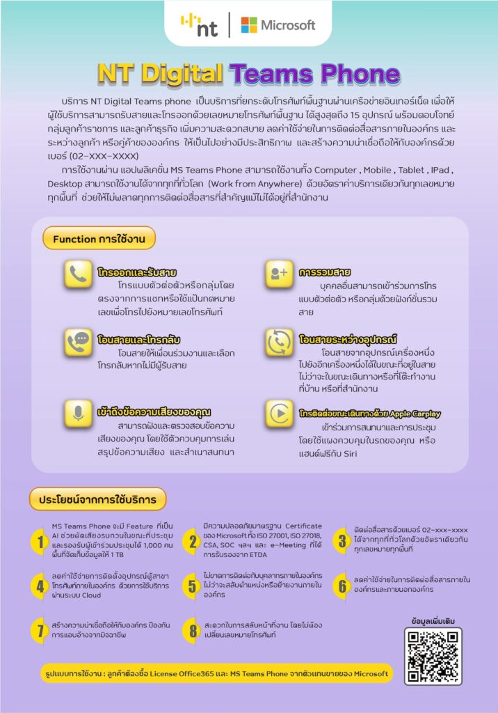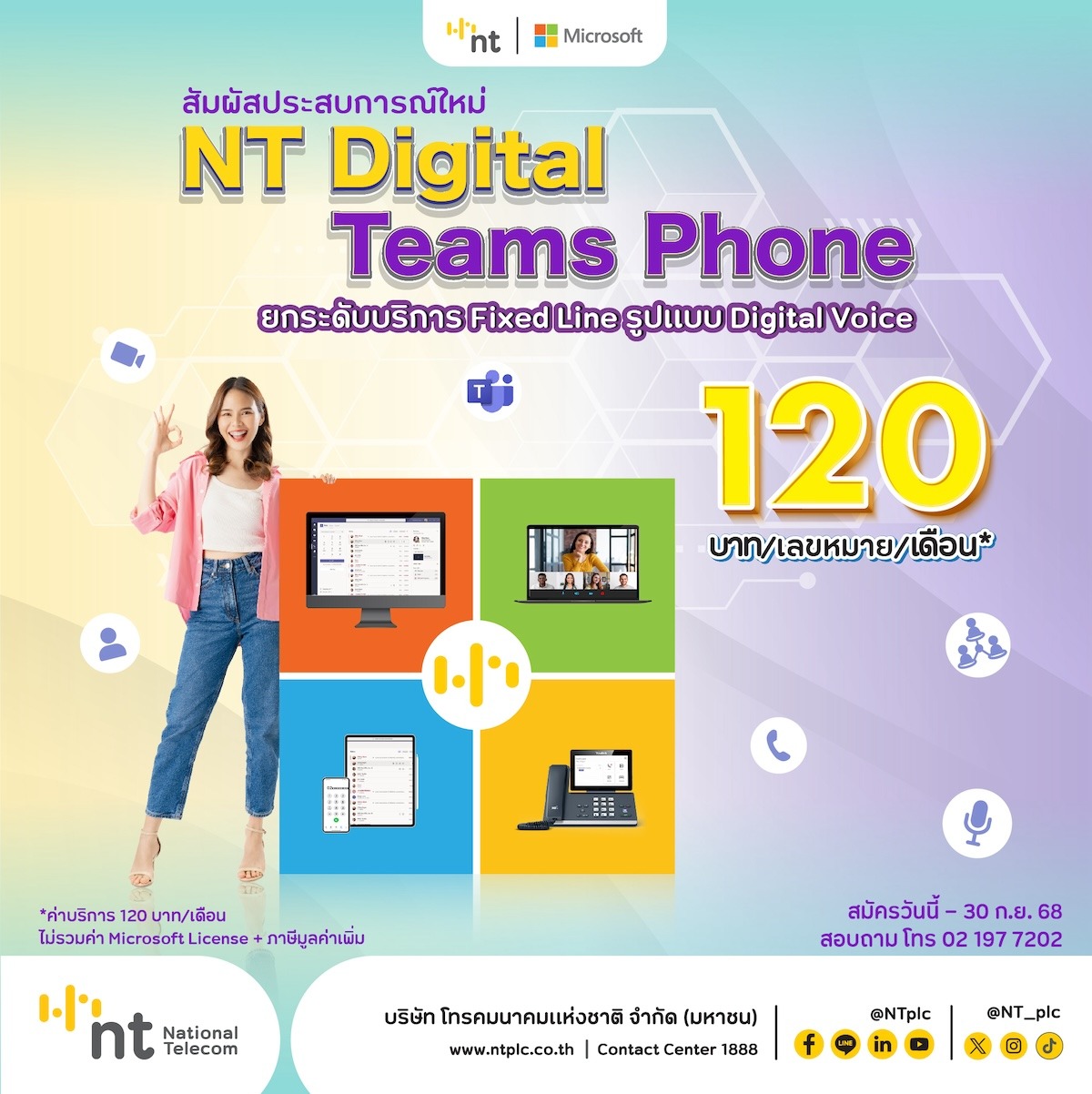 พร้อมสัมผัสประสบการณ์ใหม่ กับบริการ NT Digital Teams Phone ยกระดับบริการ Fixed Line รูปแบบ Digital Voice สอบถามรายละเอียดเพิ่มเติม โทร 02 197 7202 หรือ 1888 หรือ www.ntplc.co.th (https://ntplc.co.th/promotion-detail/nt-digital-teams-phone)
