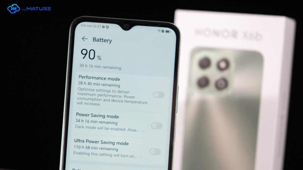 ภายในกล่อง HONOR X6b มากับอะเดปเตอร์ชาร์จที่รองรับ HONOR Super Charge 35W สามารถชาร์จ 10 นาที ได้แบตเตอรี 20% ในโหมด HONOR Super Charging Boost รวมถึงมีโหมดยืดอายุการใช้งานแบตเตอรี 10% ยังสแตนบายใช้งานได้นานกว่า 19 ชั่วโมง ในกรณีฉุกเฉิน