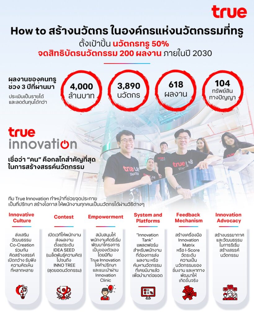 “True Innovation เชื่อว่า ‘คน’ คือกลไกสำคัญที่สุดในการสร้างสรรค์สิ่งใหม่ๆ ในองค์กร ทีมเรา จึงทำหน้าที่ช่วยจุดประกาย เป็นที่ปรึกษา สร้างโอกาส ให้พนักงานทุกคนเป็นนวัตกรได้ โดยในช่วง 3 ปีที่ผ่านมา พนักงานทรู พัฒนานวัตกรรมไปแล้วกว่า 600 ผลงาน มีพนักงานที่เป็นนวัตกรกว่า 4,000 คน ยื่นจดทรัพย์สินทางปัญญาได้กว่า 100 ผลงาน ประเมินเป็นรายได้และลดต้นทุนได้กว่า 4,000 ล้านบาท โดยตั้งเป้าหมายที่จะสร้างนวัตกรทรูให้ได้ 50% จากจำนวนพนักงานทั้งหมด พร้อมจดสิทธิบัตรนวัตกรรมให้ได้ 200 ผลงาน ภายในปี 2030” วีรศักดิ์ กล่าวสรุป