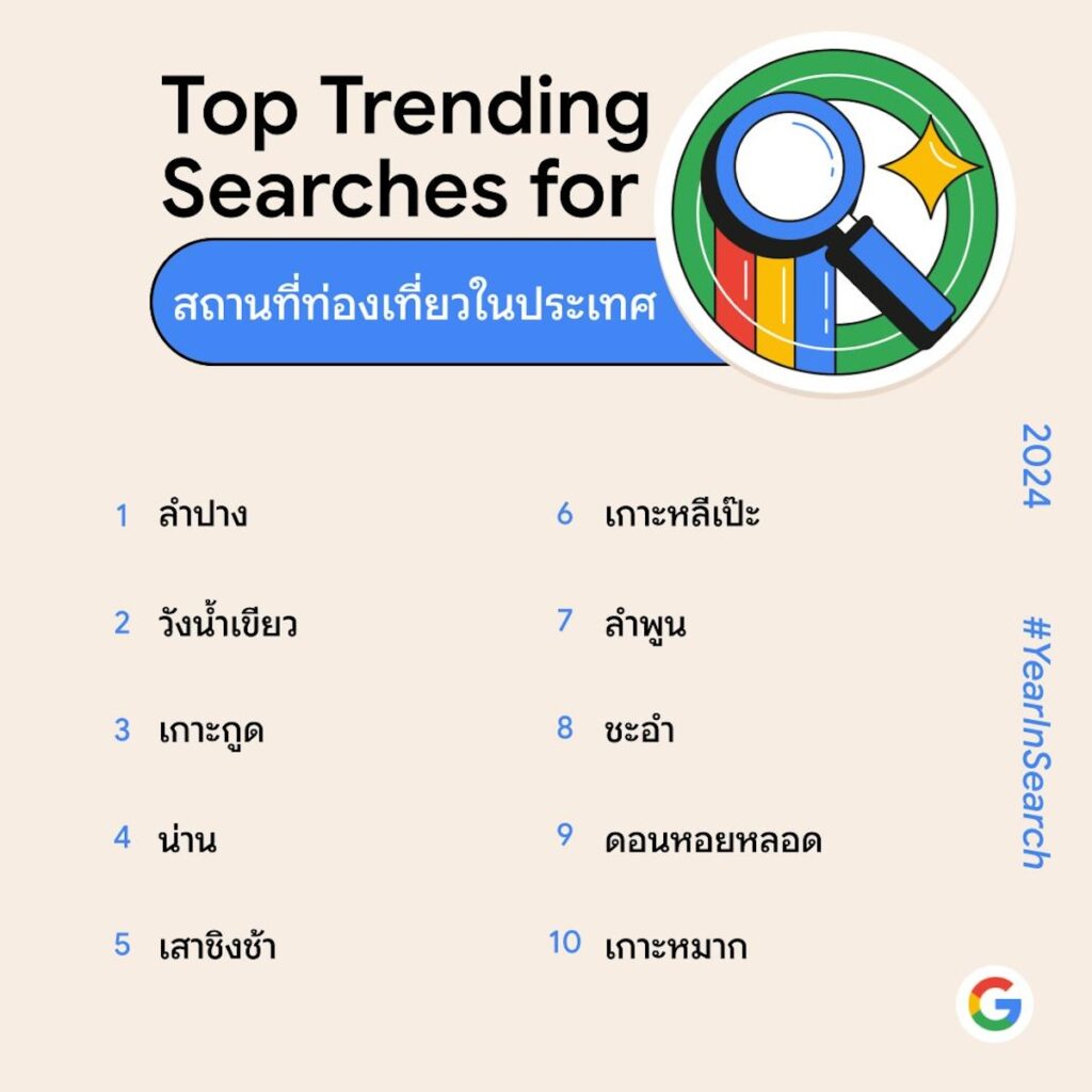 การท่องเที่ยวในประเทศไทยยังคงคึกคักตามนโยบายรัฐที่เพิ่มวันหยุดในเทศกาลต่างๆ โดยในปีนี้เทรนด์การท่องเที่ยวเน้นไปสายธรรมชาติและวัฒนธรรม โดยคำค้นหายอดนิยมหมวดสถานที่ท่องเที่ยวในประเทศในปีนี้ “ลำปาง” ครองอันดับ 1 ตามมาด้วย “วังน้ำเขียว” “เกาะกูด” “น่าน” และ “เสาชิงช้า” ในอันดับ 2-5 ตามลำดับ
