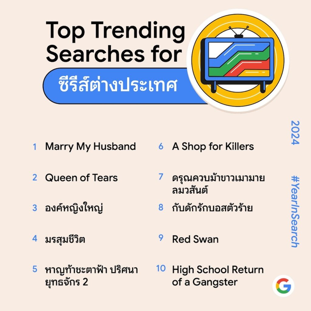 ในปีนี้ วงการละครและซีรีส์ต่างประเทศได้แสดงให้เห็นถึงเทรนด์ที่เปลี่ยนไปอย่างชัดเจน ซึ่งคนไทยหันไปนิยมชมละครและซีรีส์จีนอย่างล้นหลาม โดยติดอันดับ 5 ใน 10 นับเป็นสัดส่วนเท่ากับซีรีส์เกาหลี แม้กระนั้น ละครและซีรีส์จากเกาหลียังคงครองใจผู้ชมในไทยอย่างเหนียวแน่น จากคำค้นหา “Marry My Husband” ที่ครองอันดับ 1 จากคำค้นหาคำยอดนิยมหมวดละครและซีรีส์ต่างประเทศ ตามด้วย “Queen of Tears” ในอันดับ 2