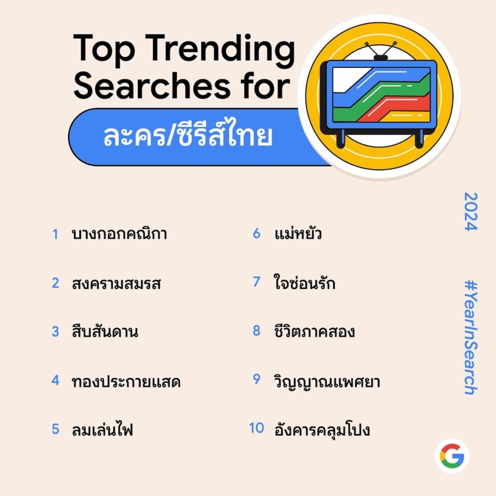 การใช้เวลาร่วมกันของครอบครัวเพื่อพักผ่อนหย่อนใจภายในบ้าน โดยเฉพาะการรับชมละครและซีรีส์ผ่านแพลตฟอร์มสตรีมมิ่งต่างๆ ส่งผลให้การค้นหาเกี่ยวกับละครและซีรีส์ไทยเป็นที่นิยมบน Google Search โดย “บางกอกคณิกา” ครองอันดับ 1 จากคำค้นหายอดนิยมหมวดละครและซีรีส์ไทย ขณะที่ “สงครามสมรส” “สืบสันดาน” “ทองประกายแสด” “ลมเล่นไฟ” และ “แม่หยัว” ติดโผอันดับ 2-6 ตามลำดับ ซึ่งก็ได้รับความสนใจไม่แพ้กัน
