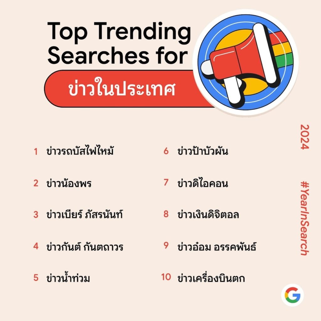 พฤติกรรมการค้นหาในปีนี้สะท้อนให้เห็นถึงความต้องการของคนไทยที่มุ่งเน้นการเข้าถึงข้อมูลที่รวดเร็ว แม่นยำ และทันต่อเหตุการณ์ ทั้งในระดับประเทศและต่างประเทศ จากคำค้นหาได้บ่งบอกถึงความสนใจในเหตุการณ์ที่ส่งผลต่อชีวิตและความปลอดภัย เช่น “ข่าวรถบัสไฟไหม้” ครองอันดับ 1 จากคำค้นหายอดนิยมในหมวดข่าวในประเทศ ตามมาด้วย “ข่าวเครื่องบินตก” และ “ข่าวน้ำท่วม” นอกจากนี้ ข่าวอาชญากรรมและเหตุการณ์ในสังคมก็ได้รับความสนใจไม่น้อย เช่น “ข่าวน้องพร” “ข่าวป้าบัวผัน” และ “ข่าวกันต์ กันตถาวร” ที่ติดโผ 10 อันดับแรกในหมวดนี้ด้วยเช่นกัน