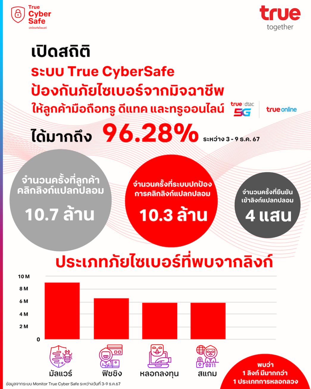 ล่าสุด ทีมงานทรู คอร์ปอเรชั่นได้เปิดเผยข้อมูลสถิติที่รวบรวมได้ระหว่างการเปิดระบบTrue CyberSafe เพียง 7 วัน(ระหว่างวันที่ 3 – 9 ธันวาคม 2567) พบข้อมูลที่น่าสนใจคือจำนวนครั้งที่ลูกค้าคลิกลิงก์แปลกปลอมทั้งหมด 10,773,877 ล้านครั้ง สามารถปกป้องลูกค้าจากการคลิกลิงก์แปลกปลอมได้ถึง10.3ล้านครั้งคิดเป็น96.28%ที่ระบบสามารถปกป้องได้