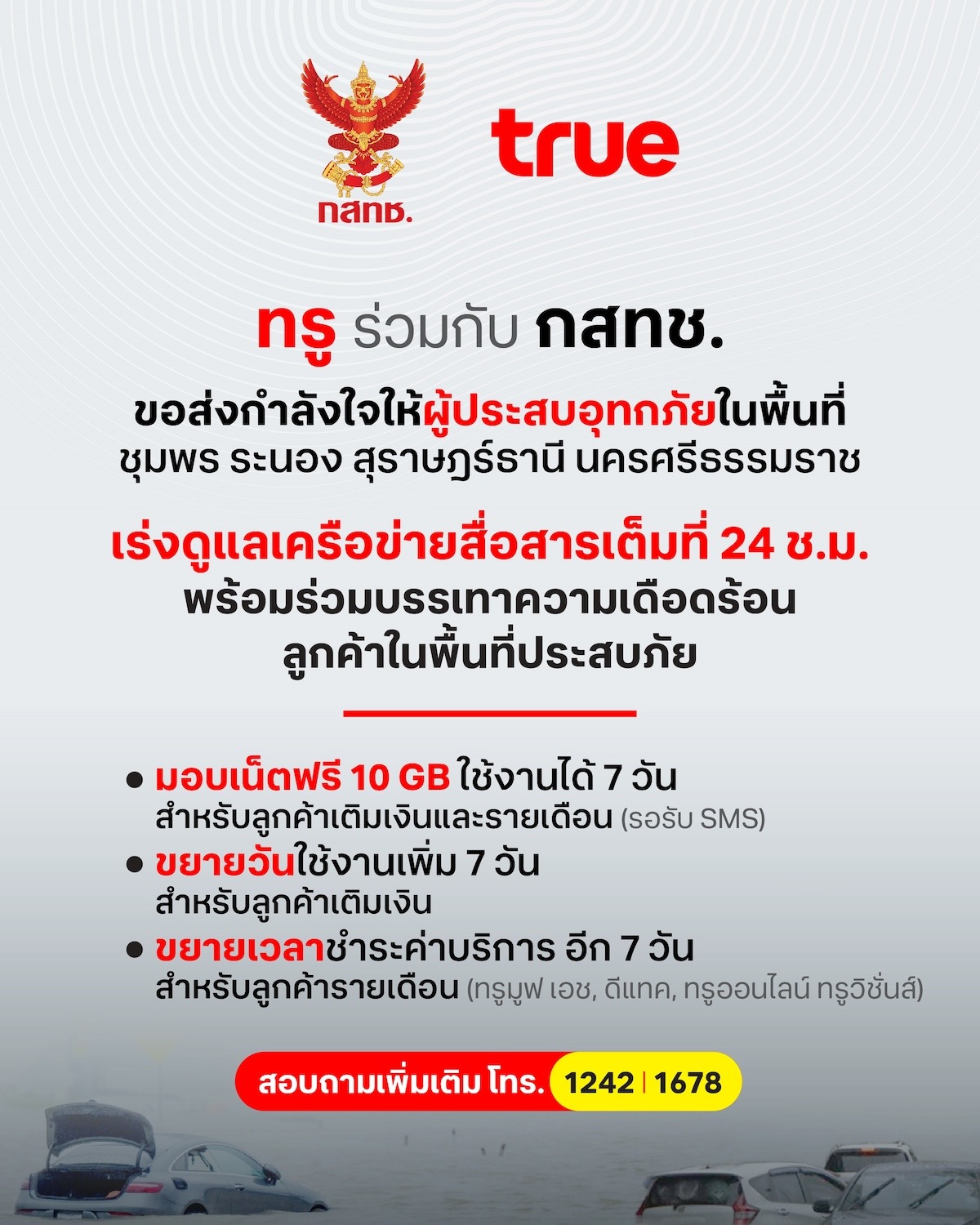 จากสถานการณ์น้ำท่วมล่าสุดในพื้นที่ 4 จังหวัดภาคใต้ได้แก่ ชุมพร ระนอง สุราษฎร์ธานี และนครศรีธรรมราช ทรูร่วมกับสำนักงานกสทช.ขอส่งกำลังใจให้ผู้ประสบอุทกภัยรวมถึงเจ้าหน้าที่ที่ปฏิบัติงานช่วยเหลือผู้ประสบภัย พร้อมออกมาตรการช่วยเหลือดูแลลูกค้าในพื้นที่ทั้ง 4 จังหวัดร่วมแบ่งเบาภาระทั้งมอบเน็ตฟรี ขยายวันใช้งานและขยายเวลาชำระค่าบริการรวมทั้งจัดทีมเน็ตเวิร์คดูแลเครือข่ายทั้งโมบายล์ทรู ดีแทคและไฟเบอร์ทรูออนไลน์ ตลอด 24 ชั่วโมงเพื่อให้ลูกค้าใช้งานติดต่อสื่อสารได้ต่อเนื่อง และร่วมสนับสนุนน้ำดื่มและชุดถุงยังชีพมอบให้กับผู้ประสบภัยในพื้นที่