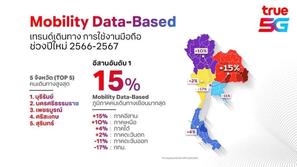 ทั้งนี้ จากข้อมูล Mobility Data ของทรูในช่วงเทศกาลปีใหม่ 2567 ที่ผ่านมาได้สะท้อนให้เห็นการเคลื่อนย้ายของประชาชนอย่างชัดเจน โดยภาคอีสานเป็นจุดหมายปลายทางยอดนิยม มีผู้เดินทางเข้าพื้นที่เพิ่มขึ้นถึง 15% รองลงมาคือภาคเหนือที่เพิ่มขึ้น 10% ส่วนภาคใต้และภาคตะวันตกมีนักท่องเที่ยวเพิ่มขึ้น 4% และ 2% ตามลำดับ ในทางกลับกัน กรุงเทพมหานครมีประชาชนเดินทางออกนอกพื้นที่มากถึง 17% และภาคตะวันออกลดลง 11% สะท้อนวิถีของคนเมืองที่นิยมเดินทางกลับภูมิลำเนาหรือท่องเที่ยวต่างจังหวัดในช่วงเทศกาลปีใหม่ โดยทรูได้นำชุดข้อมูลนี้มาวิเคราะห์เพื่อวางแผนเพิ่มประสิทธิภาพสัญญาณให้สอดคล้องกับพฤติกรรมการใช้งานในช่วงเทศกาลปีใหม่ 2568 อีกด้วย