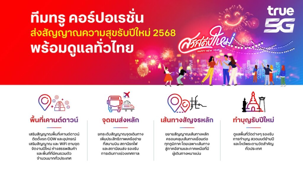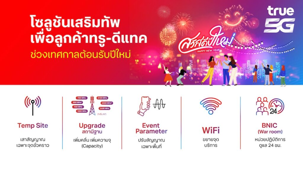 ทรู อัดเน็ตเวริร์ก 5G, 4G และ WiFi ให้ลูกค้าทรูและดีแทคเชื่อมต่อส่งความสุขครอบคลุมทุกพื้นที่ทั่วไทยในช่วงเทศกาลปีใหม่ เผยวิเคราะห์ข้อมูลพฤติกรรมการเดินทางและการจัดอีเวนท์ช่วงเทศกาลเคานต์ดาวน์ปีที่ผ่านมาเพื่อวางแผนขยายสัญญาณพื้นที่เคานต์ดาวน์สำคัญปีใหม่นี้นำ BNIC ศูนย์ปฏิบัติการเครือข่ายอัจฉริยะพร้อมระบบ AI และหน่วยปฏิบัติการเฉพาะกิจ หรือ วอร์รูมทุกภูมิภาคเพื่อบริหารจัดการเครือข่ายตลอด 24 ชั่วโมง รวมทั้งยังมอบความสุขด้วยแคมเปญ “ยิ้มทั่วไทย” พร้อมของขวัญพิเศษมากมายที่ส่งตรงถึงลูกค้าด้วยสัญญาณทรู ดีแทค 5G เร็ว แรงต้อนรับปีใหม่