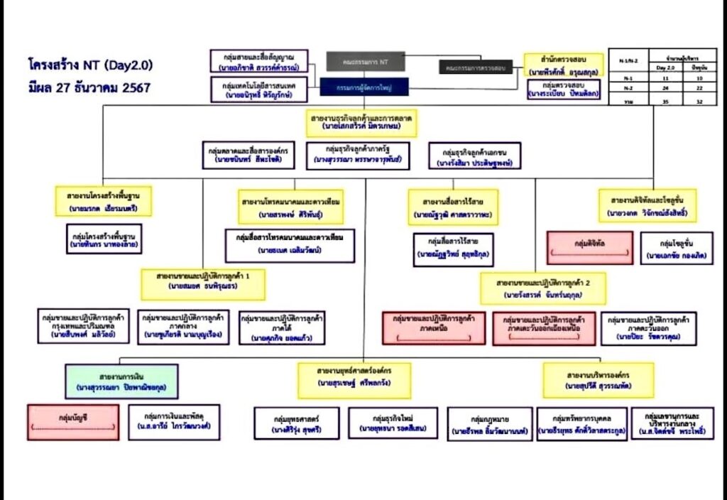 ‘ปีหน้าทุกสายงานจะมีจ็อบที่ชัดเจน เลเวลการตัดสินใจจะลงไปที่กลุ่มงานมากยิ่งขึ้น จากเดิมเห็นไม่ตรงกัน ทุกเรื่องจะวิ่งมาที่ซีอีโอ ต่อไปกลุ่มงานจะเป็นพระเอกที่คอนโทรลเรื่องการดำเนินงานให้เป็นแบบเดียวกันแต่โครงสร้างไม่หยุดเท่านี้ต้องปรับเรื่อยๆเราจะเริ่มลีนลงและพร้อมที่จะออกเดิน’พ.อ.สรรพชัยย์ หุวะนันทน์ กรรมการผู้จัดการใหญ่ บริษัท โทรคมนาคมแห่งชาติ จำกัด (มหาชน) หรือ NT กล่าว