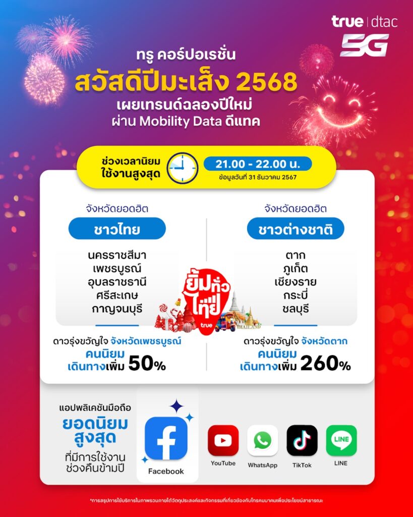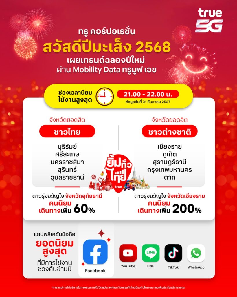 ทรู คอร์ปอเรชั่นเผยดาต้าฉลองต้อนรับปีมะเส็ง 2568 เทรนด์การใช้งานมือถือ เน็ตบ้านสุดคึกปีนี้ไทยจัดเคานต์ดาวน์กระหึ่ม อาทิ ไอคอนสยามกับงานเฉลิมฉลองศักราชใหม่ “Amazing Thailand Countdown 2025” พร้อมเชิญ “ลิซ่า ลลิษา มโนบาล”มาเยือน เผยยอดใช้งานดาต้าพื้นที่ไอคอนสยามในคืนเคานต์ดาวน์สูงมากกว่า 200% จากการใช้งานในช่วงเทศกาล ด้าน Mobility Data การเดินทางท่องเที่ยวปีใหม่ และการใช้มือถือจากผู้ใช้งานแบรนด์ทรู และดีแทคสุดพีคจากเทศกาลตามคาดการณ์ พบไฮไลท์น่าจับตา 10 จังหวัดท่องเที่ยวยอดนิยมของคนไทยและต่างชาติ พร้อมรายงาน 5 แอปพลิเคชันครองใจคนใช้งานทั้งมือถือและเน็ตบ้าน ขณะที่แอปทรูไอดี (TrueID) โดยรวมมียอดผู้ใช้งานในช่วงเทศกาลเพิ่มขึ้นราว 500%