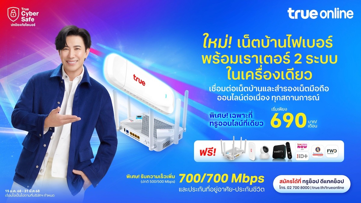 ทรูออนไลน์ เปิดตัว “เราเตอร์ 2 ระบบ”ใช้งานอินเทอร์เน็ตได้ทั้งระบบสายไฟเบอร์ และสัญญาณเน็ตมือถือ ท่องโลกออนไลน์ได้ต่อเนื่องไม่มีสะดุดในกรณีฉุกเฉิน เมื่อเกิดปัญหาการเชื่อมต่อไฟเบอร์ เราเตอร์จะเปลี่ยนไปใช้อินเทอร์เน็ตมือถือแบบอัตโนมัติทันที อำนวยความสะดวกให้ใช้งานออนไลน์ในบ้านได้แบบต่อเนื่องไม่ต้องตั้งค่า WIFI ใหม่ หรือไม่ต้องติดตั้งอุปกรณ์เพิ่มเติมไม่ว่าจะเทรดหุ้นหรือไลฟ์สตรีมลูกค้าใหม่สามารถสมัครแพ็กเกจเน็ตบ้านเราเตอร์ 2 ระบบราคาเริ่มต้นเดือนละ 690 บาท ความเร็ว 700/700 Mbps พร้อมสิทธิพิเศษมากมายตั้งแต่วันนี้ถึง 31 มีนาคม 2568