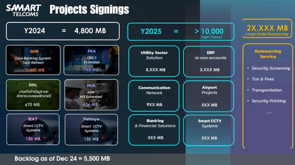 ปัจจุบันมีงานในมือแล้วมูลค่ากว่า 5,500 ล้านบาท ที่จะทยอยรับรู้รายได้ในปีต่อๆไป โดยตั้งเป้ารายได้ปี 2025 อยู่ที่ 6,500 ล้านบาท มั่นใจว่าปีนี้สายธุรกิจ ICT จะเติบโตไม่ต่ำกว่า40%ด้วยโอกาสจากหลายโครงการที่เลื่อนมาจากปีที่แล้ว ประกอบกับโครงการใหม่จากมาตรการกระตุ้นเศรษฐกิจใหม่ๆ จากภาครัฐ รวมถึงนโยบายบูรณาการด้านเทคโนโลยี เพื่อต่อยอดการให้บริการด้านต่าง ๆ คาดว่าในปีนี้ จะมีโครงการใหม่ ๆ ที่จะเข้าร่วมประมูลทั้งโครงการรูปแบบ Outsource Services ขนาดใหญ่หลักหมื่นล้านบาท