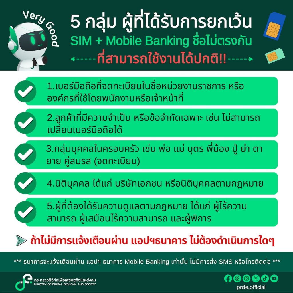 “อย่างไรก็ตามเพื่อไม่ให้เกิดความสับสนและความวิตกกังวลต่อประชาชน กระทรวงดีอีขอแจ้งว่า ธนาคารได้ส่งข้อความแจ้งเตือนกลุ่มที่ต้องยืนยันตัวตน ทั้ง 2 กลุ่มไปแล้วทั้งหมด ซึ่งหากบุคคลใดไม่ได้รับการแจ้งเตือนผ่านแอปฯ Mobile Banking จากธนาคารโดยตรง บุคคลนั้นไม่จำเป็นต้องดำเนินการใดๆทั้งสิ้น โดยขอย้ำว่าธนาคารไม่มีนโยบายแจ้งเตือนโดยการโทรติดต่อโดยตรง หรือการส่งข้อความ SMS แนบลิงก์ ซึ่งหากพบการกระทำดังกล่าว ให้ถือว่าเป็นการหลอกลวงจากมิจฉาชีพ ขอให้หลีกเลี่ยงการพูดคุยหรือการกระทำใดๆ ที่อาจส่งผลกระทบสร้างความเสียหายต่อทรัพย์สินและข้อมูลส่วนบุคคลได้”
