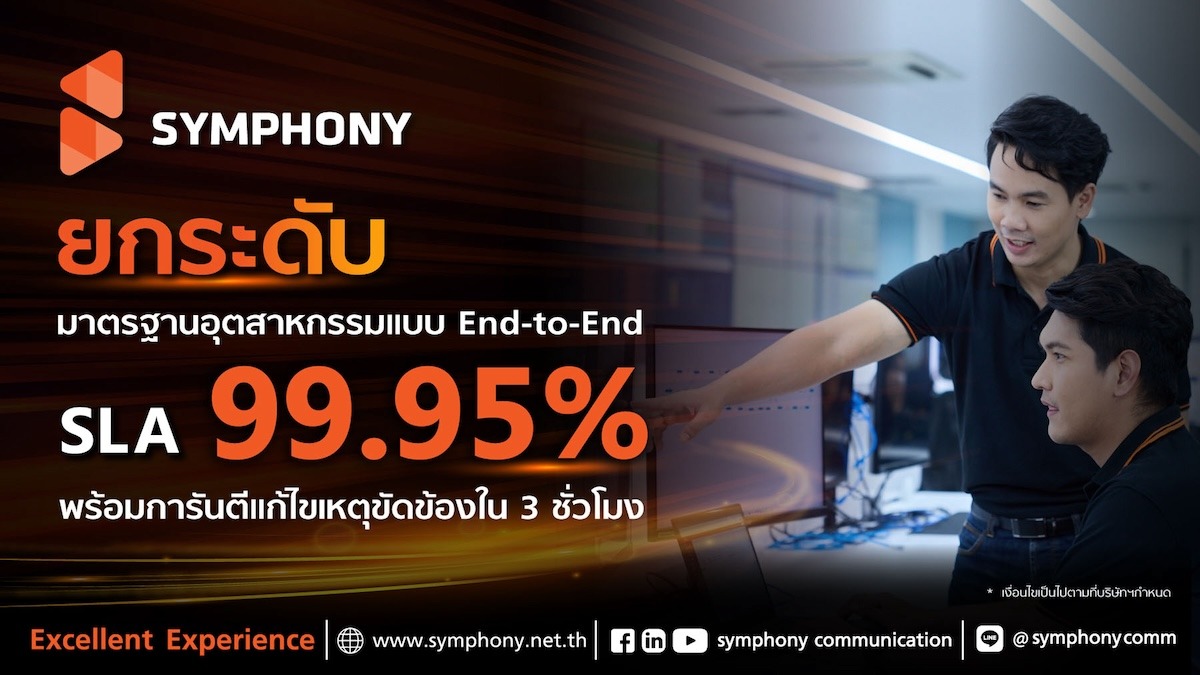 SYMPHONY ผู้ให้บริการโครงข่ายสื่อสารโทรคมนาคมชั้นนำ ประกาศยกระดับ Service Level Agreement หรือ SLA (มาตรฐานการให้บริการ) ที่ระดับ 99.95% ครอบคลุมการเชื่อมต่อแบบครบวงจร (End-to-End) ซึ่งเป็นมาตรฐานใหม่ในอุตสาหกรรมโทรคมนาคม ช่วยลดระยะเวลาหยุดทำงาน (Downtime) และเป็นรายแรกที่รับประกันการแก้ไขปัญหาภายใน 3 ชั่วโมง (MTTR – Mean Time to Repair)การพัฒนานี้สะท้อนถึงความมุ่งมั่นของ SYMPHONY ในการใช้เทคโนโลยีที่ล้ำสมัย อาทิ ปัญญาประดิษฐ์ (AI) และโครงข่ายอัจฉริยะผ่าน Software-Defined Network (SDN) เพื่อเพิ่มความน่าเชื่อถือของระบบสำหรับลูกค้าองค์กร โดย SLA ที่ยกระดับนี้จะช่วยลดความเสี่ยงจากการหยุดชะงักทางธุรกิจ ป้องกันการเสียโอกาสทางธุรกิจของลูกค้า และเสริมศักยภาพการเติบโตในยุคดิจิทัล