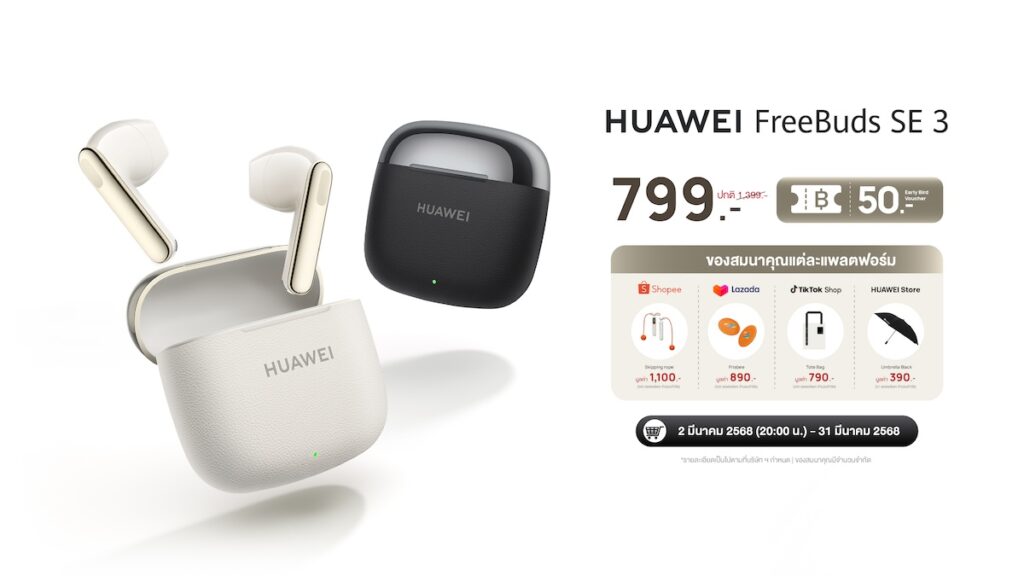 HUAWEI FreeBuds SE 3 จะเริ่มวางจำหน่ายในราคาพิเศษเพียง 799 บาท จากราคาปกติ 1,399 บาท เมื่อซื้อตั้งแต่วันที่ 2 มีนาคม 2568 (เวลา 20.00 น.) – 31 มีนาคม 2568 เฉพาะช่องทางออนไลน์ HUAWEI Store และร้านค้าอย่างเป็นทางการของหัวเว่ยบนแพลตฟอร์ม Lazada, Shopee และ TikTok Shop พร้อมรับของสมนาคุณตามเงื่อนไขแต่ละแพลตฟอร์ม