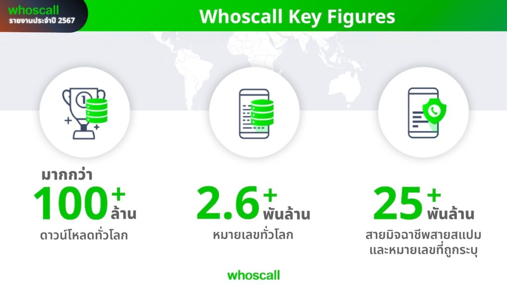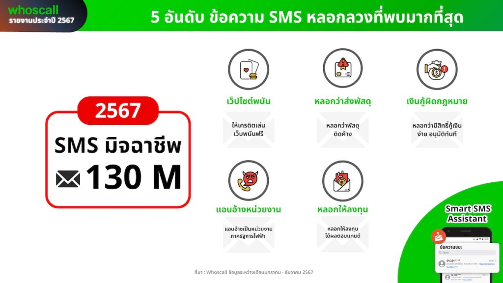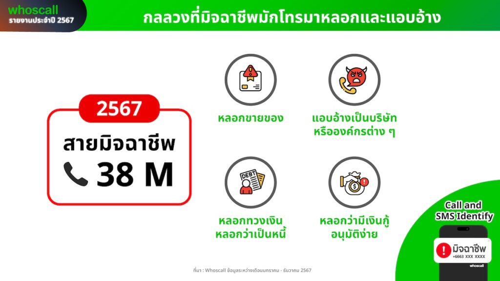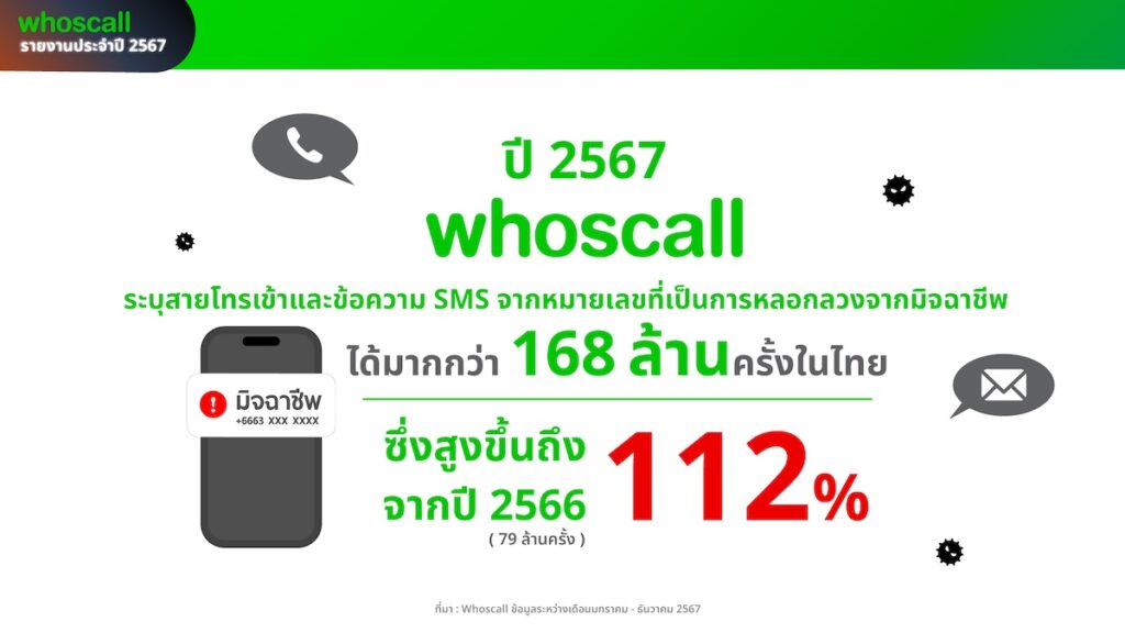 ตรวจพบสายโทรศัพท์และข้อความหลอกลวงเพิ่มขึ้นในประเทศไทย ในปี 2567 Whoscall ตรวจพบ สายโทรศัพท์และข้อความ SMS หลอกลวงสูงถึง 168 ล้านครั้ง เพิ่มขึ้นกว่า 112% จาก 79.2 ล้านครั้งในปี 2566 และถือเป็นยอดที่สูงสุดในรอบ 5 ปีของประเทศไทย ในส่วนของจำนวนการโทรหลอกลวงเพิ่มขึ้นเป็น 38 ล้านครั้ง จาก 20.8 ล้านครั้งในปี 2566 ขณะที่จำนวนข้อความ SMS หลอกลวงพุ่งสูงถึงเกือบ 130 ล้านครั้ง จาก 58.3 ล้านครั้งในปี 2566 กลโกงที่พบมากที่สุด ได้แก่ การหลอกขายบริการและสินค้าปลอม การแอบอ้างตัวเป็นหน่วยงาน และหลอกว่ามีเงินกู้อนุมัติง่าย การหลอกทวงเงิน การหลอกว่าเป็นหนี้