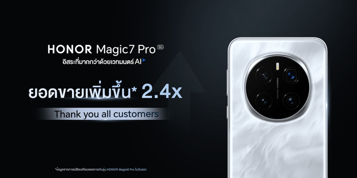 ออเนอร์ (HONOR)ประกาศความสำเร็จครั้งสำคัญของสมาร์ทโฟนระดับแฟลกชิป HONOR Magic7 Pro 5G ซึ่งได้รับกระแสตอบรับอย่างล้นหลามจากผู้บริโภค กวาดยอดขายและเติบโตสูงสุดถึง 2.4 เท่า นับตั้งแต่เปิดให้พรีออเดอร์ระหว่างวันที่ 11 – 21 กุมภาพันธ์ 2568 ทั้งช่องทางออฟไลน์และแพลตฟอร์มอีคอมเมิร์ซชั้นนำ โดยความสำเร็จครั้งนี้สะท้อนถึงความเชื่อมั่นของผู้บริโภคที่มีต่อคุณภาพผลิตภัณฑ์ นวัตกรรมและเทคโนโลยีล้ำสมัยของ HONOR โดยเฉพาะการพัฒนา AI อัจฉริยะ กล้องประสิทธิภาพสูง และระบบประมวลผลทรงพลัง ที่ออกแบบมาเพื่อตอบโจทย์ทุกไลฟ์สไตล์อย่างสมบูรณ์แบบ