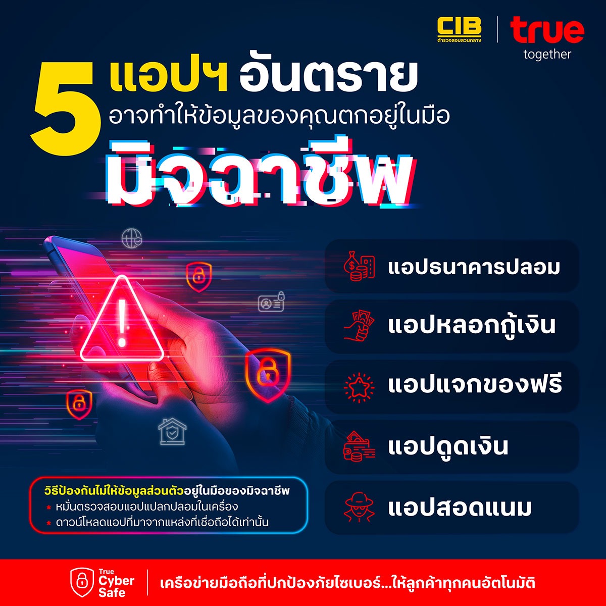 ในยุคที่เทคโนโลยีมีบทบาทสำคัญในชีวิตประจำวัน การดาวน์โหลดแอปพลิเคชันต่างๆ ก็กลายเป็นเรื่องปกติ แต่รู้หรือไม่ว่า บางแอปที่โหลดมานั้น อาจแฝงตัวเป็นภัยอันตรายที่พร้อมขโมยข้อมูลส่วนตัวได้ทุกเมื่อ! ทรู ร่วมกับ ตำรวจสอบสวนกลาง (CIB) ชี้ 5 แอปอันตรายที่อาจจะอยู่ในโทรศัพท์จากการดาวน์โหลดโดยไม่รู้ตัว พร้อมแนะวิธีป้องกันและตรวจสอบแอปเหล่านี้ ก่อนที่จะโดยมิจฉาชีพจะขโมยข้อมูลส่วนตัว
