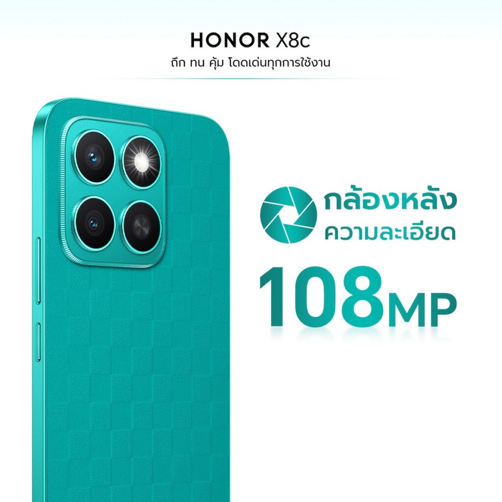 สุดยอดกล้องถ่ายภาพคมชัด 108MP พร้อม Ultra-clear Night Photograph หนึ่งในไฮไลต์ที่ทำให้ HONOR X8c โดดเด่นเหนือสมาร์ทโฟนรุ่นอื่นในระดับเดียวกัน คือ ระบบกล้องอัจฉริยะที่ช่วยให้ทุกการถ่ายภาพเป็นเรื่องง่าย โดยกล้องหลักของ HONOR X8c มีความละเอียดสูงสุดถึง 108MP (f/1.75) และกล้อง Depth & Wide ความละเอียด 5MP (f/2.2) ที่ช่วยเก็บมิติภาพอย่างเป็นธรรมชาติและเต็มไปด้วยรายละเอียด โดยกล้องหลัก 108MP ให้ผู้ใช้ถ่ายภาพได้อย่างละเอียดสูงสุดและสามารถบันทึกวิดีโอได้ที่ความละเอียดสูงถึง 1080P (Full HD) พร้อมฟีเจอร์การซูมดิจิตอลสูงสุดถึง 8 เท่า ซูมได้แบบไม่สูญเสียรายละเอียด สีสันคมชัดสมจริง