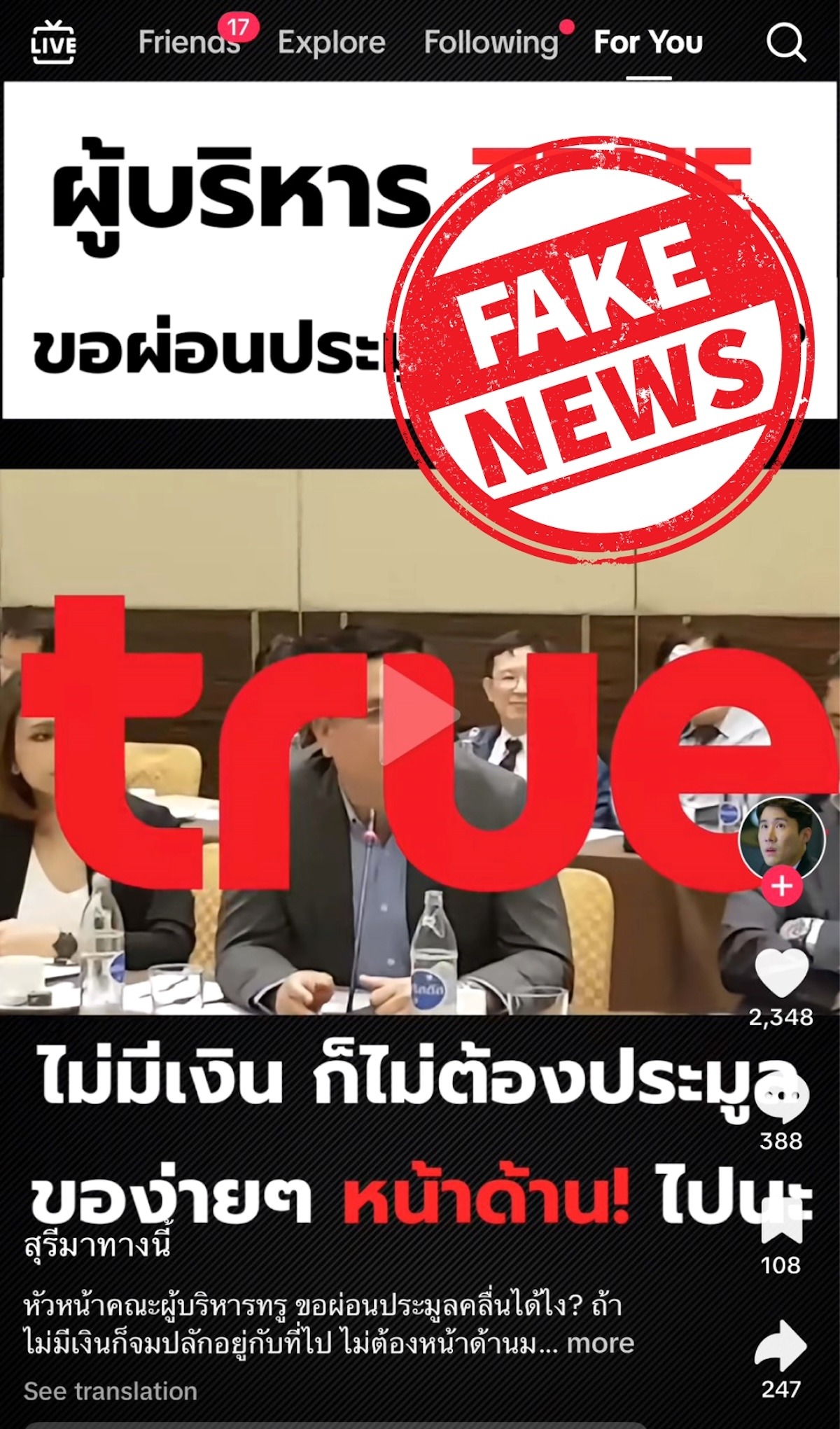 ทรู คอร์ปอเรชั่น แจ้งจับขบวนการสร้างเฟคนิวส์ มุ่งบ่อนทำลายชื่อเสียงบริษัทฯ และผู้บริหารของบริษัทฯ จากกรณีมีผู้ใช้บัญชีติ๊กต๊อก (TikTok) รายหนึ่งใช้ชื่อว่า “สุรีมาทางนี้” โพสต์คลิปวิดิโอสั้นอันเป็นข้อมูลเท็จเกี่ยวกับ ทรูอย่างต่อเนื่องโดยวิธีการตัดต่อข้อมูล นำมาจัดเสนอใหม่และบิดเบือนเพิ่มเติม รวมทั้งมีการระบุชื่อผู้บริหารทรู นำภาพเก่ามาตัดต่อปรับเนื้อหา และนำเข้าสู่ระบบคอมพิวเตอร์ ทำให้เกิดความเข้าใจผิดต่อสาธารณชน สร้างความเสียหายให้แก่ทั้งผู้บริหารที่ถูกกล่าวอ้างถึงและบริษัทฯ ลั่นเอาเรื่องผู้มีส่วนเกี่ยวข้องทั้งหมด พร้อมดำเนินคดีทางกฎหมายจนถึงที่สุด