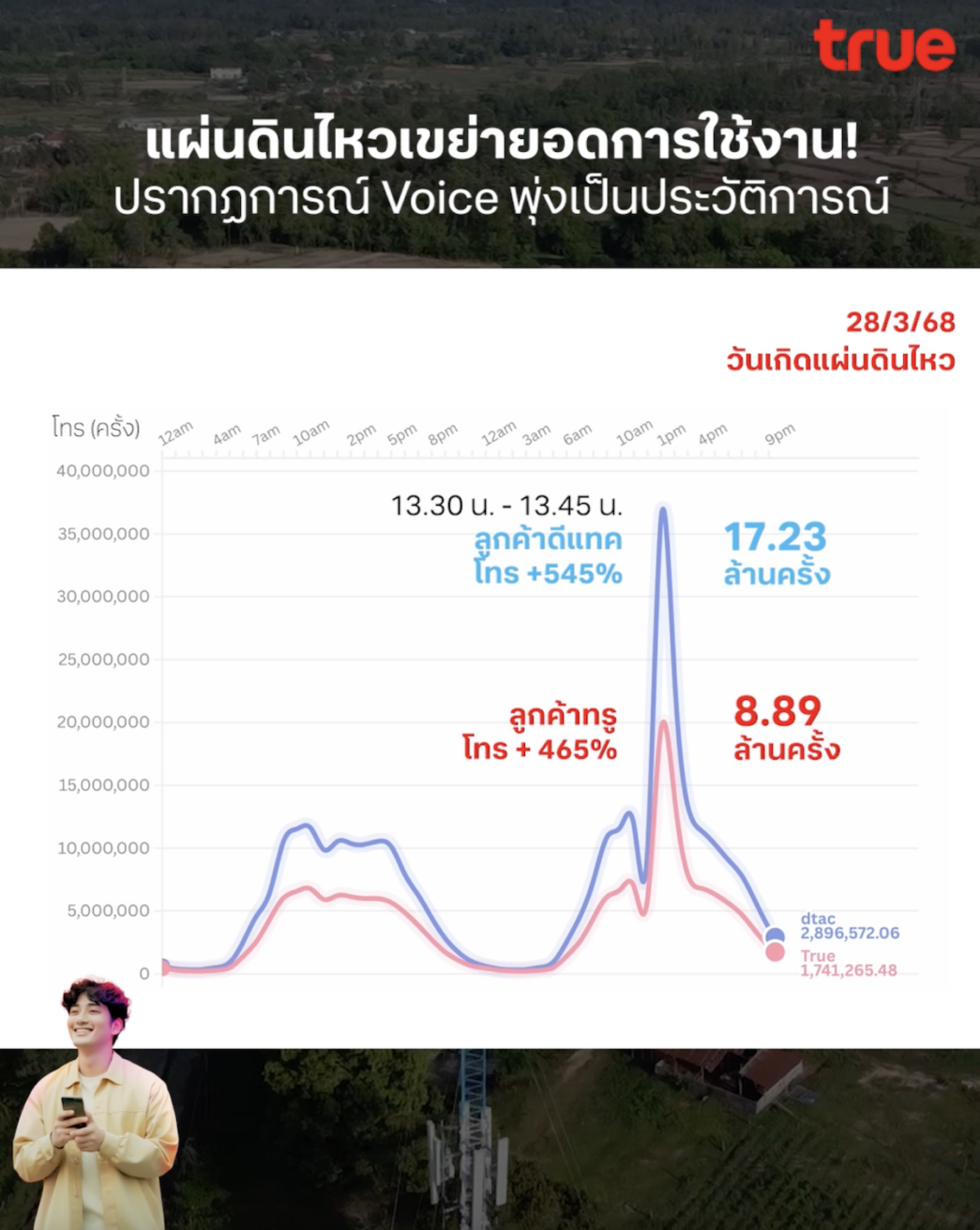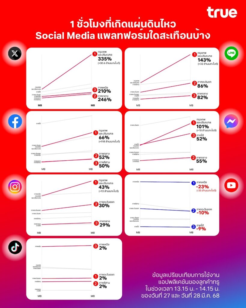 เมื่อวันที่ 28 มีนาคม 2568 เวลาประมาณ 13.25 น. ประเทศไทยรับรู้แรงสั่นสะเทือนจากเหตุแผ่นดินไหว ซึ่งสามารถรู้สึกได้ในหลายพื้นที่ของกรุงเทพมหานครและจังหวัดใกล้เคียง ภายในเวลาไม่ถึง 5 นาทีพฤติกรรมการสื่อสารของผู้ใช้งานบนเครือข่ายทรูและดีแทคเปลี่ยนแปลงอย่างฉับพลัน โดยปริมาณการโทรออก(Voice Call) พุ่งสูงเฉลี่ยกว่า 5 เท่า ขณะเดียวกัน การใช้งานดาต้า(Data) ก็เปลี่ยนทิศทางอย่างเห็นได้ชัด การโทรกลายเป็นช่องทางเร่งด่วนในการติดต่อระหว่างบุคคล ส่วนดาต้าถูกใช้เพื่อการสื่อสารอย่างมีเป้าหมาย ผ่านแอปอย่าง LINE Messenger และ X เพื่อติดต่อ ตอบกลับข้อความ และเช็กข้อมูลข่าวสาร สะท้อนพฤติกรรมของผู้ใช้งานในภาวะฉุกเฉินที่ต้องการติดต่อสื่อสารอย่างทันท่วงที