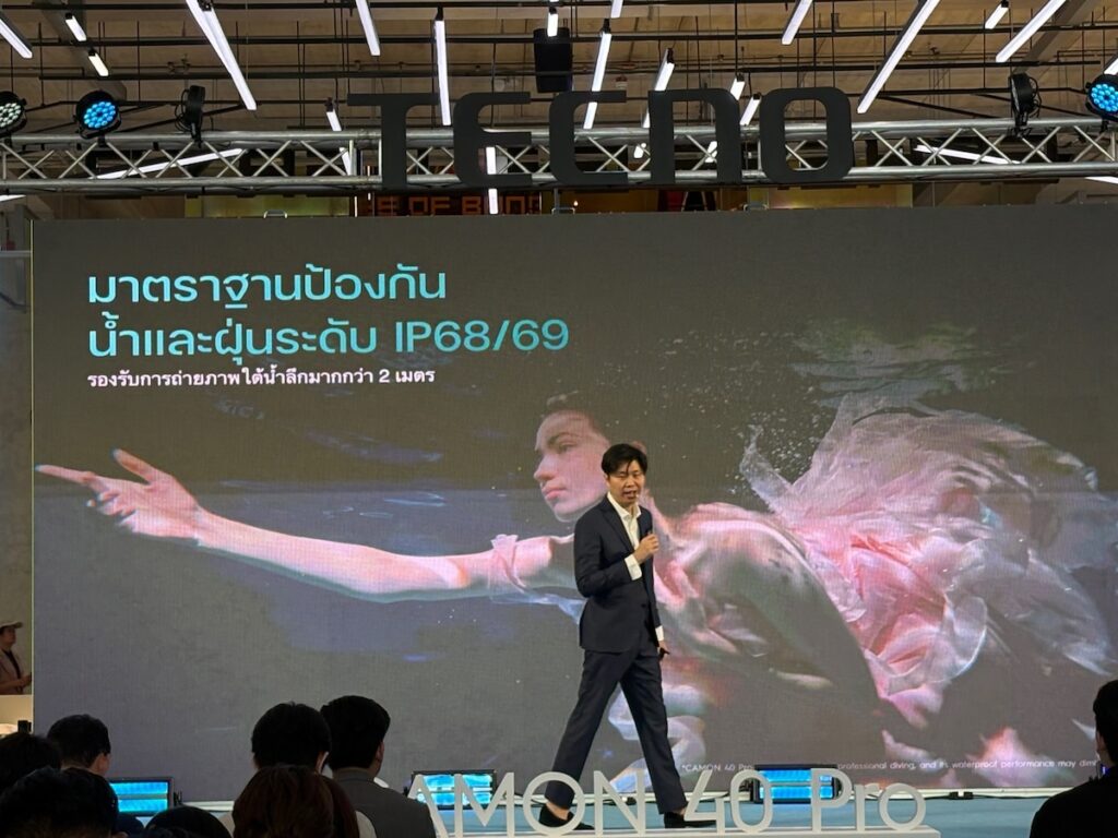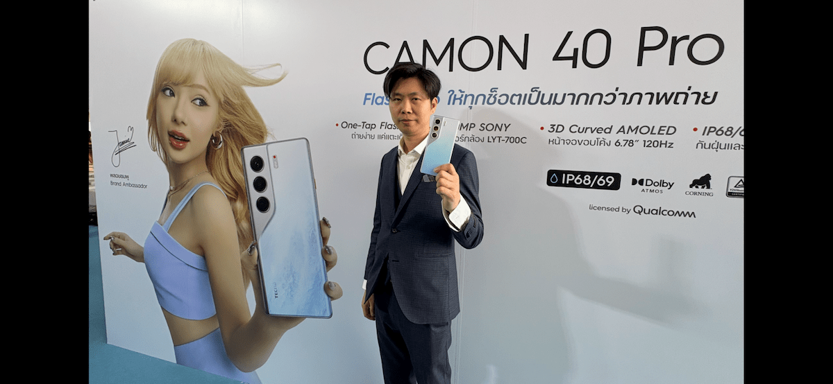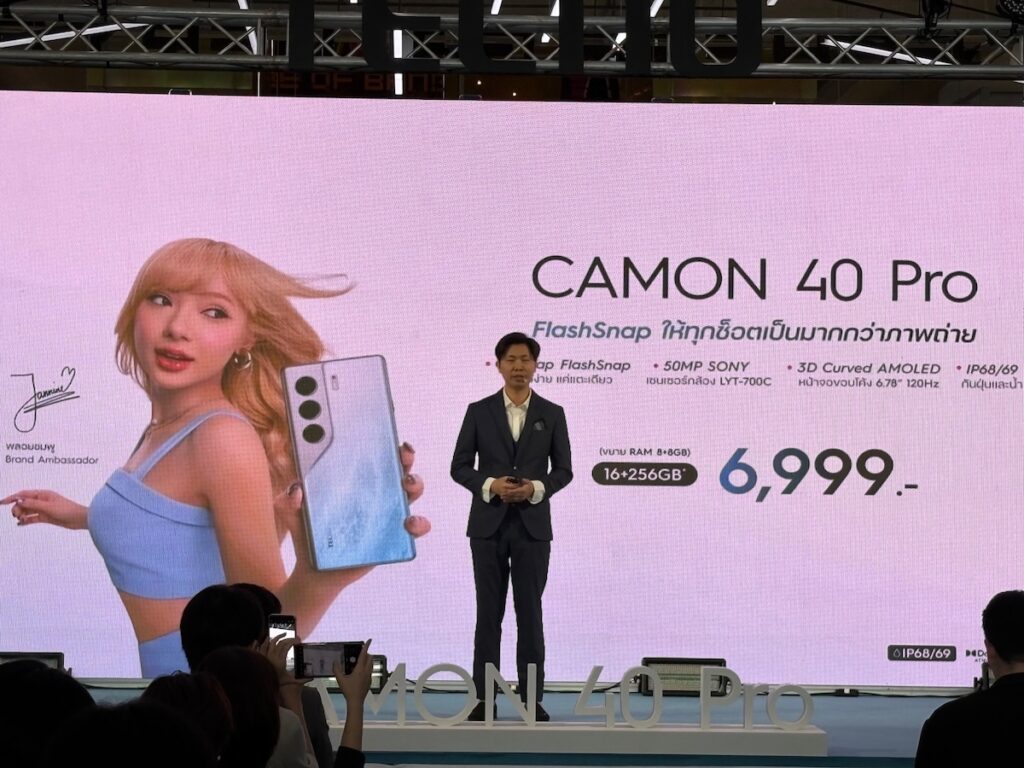 สร้างสีสันตลาดสมาร์ทโฟนมิดเรนจ์ในไทยและอาเซียนอีกครั้งกับการเปิดตัวTECNO CAMON 40 Pro โดดเด่นที่กล้องหลัก ความคมชัด 50MP  พร้อมเซ็นเซอร์กล้อง Sony LYT-700C + OIS กล้องหน้า 50MP AF หน้า จอ  AMOLED 120Hz กันรอย Gorilla Glass 7i แบต 5,200 mAh ชาร์จเร็ว 45W พร้อมมาตรฐาน IP68/IP69 ตั้งเป้าจับกลุ่ม Gen Z และ  Millennial ที่ต้องการสมาร์ตโฟนประสิทธิภาพสูงพร้อมเปิดตัวพรีเซ็นเตอร์คนใหม่ “พลอยชมพู”ศิลปินวัยรุ่นสายครีเอทีฟสะท้อนตัวตนของสมาร์ตโฟนครองใจตลาดไทย ในราคาสุดคุ้มเพียง 6,999 บาท