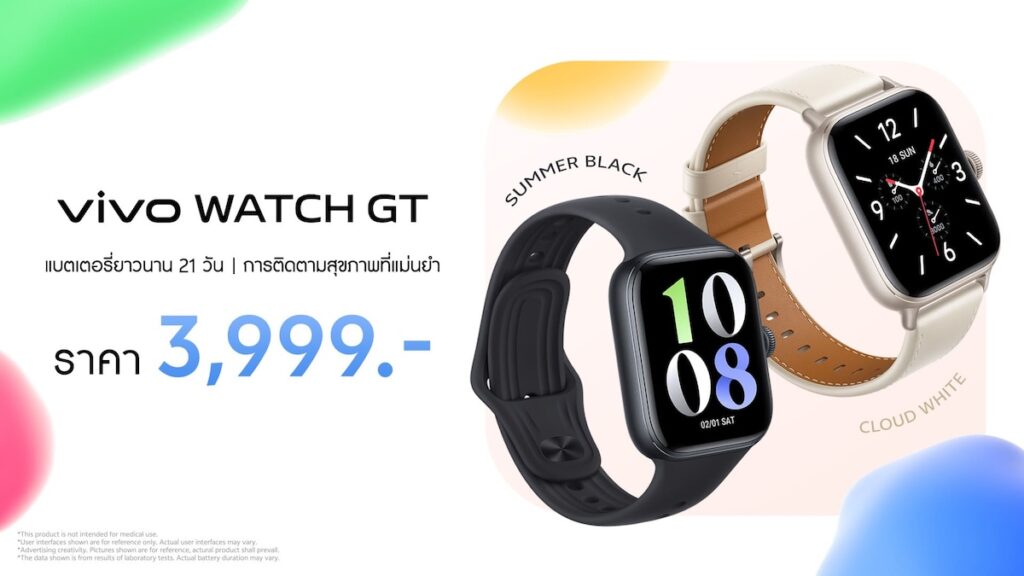 vivo วางจำหน่าย Watch GT ใน 2 ตัวเลือกสีและดีไซน์ ได้แก่ สีดำซัมเมอร์ แบล็ก (Summer Black) พร้อมสายซิลิโคนเพื่อการใช้งานในชีวิตประจำวัน และสีขาวคลาวด์ ไวท์ (Cloud White) พร้อมสายหนังแบบเรียบหรูและคลาสสิก ในราคาเพียง 3,999 บาท