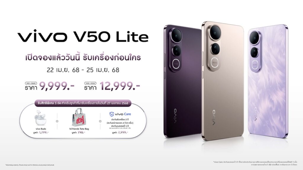 vivo V50 Lite วางจำหน่ายใน 2 รุ่นความจุ ได้แก่ 8GB + 256GB ในราคา 9,999 บาท และ 12GB + 512GB ในราคา 12,999 บาท พิเศษสำหรับผู้ที่สั่งซื้อในรอบพรีออเดอร์และรอบปกติ ภายในวันที่ 22 เมษายน – 31 พฤษภาคม 2568 จะได้สิทธิ์รับของสมนาคุณจาก vivo ประกอบด้วย