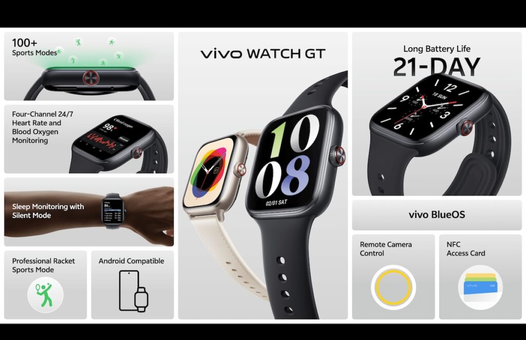 vivo Watch GT สมาร์ตวอตช์หน้าปัดทรงสี่เหลี่ยมรุ่นแรกจาก vivo มาพร้อมดีไซน์หรูหราทันสมัย น้ำหนักเบาเพียง 33 กรัม และหน้าจอ 2.5D HD AMOLED ขนาด 1.85 นิ้ว รองรับ Always-on Display สวมใส่สบายเข้ากับสรีระข้อมือ นำเสนอบน 2 ดีไซน์ที่สามารถเลือกปรับเปลี่ยนได้ตามสไตล์ของผู้ใช้งาน ได้แก่ สีดำซัมเมอร์ แบล็ก (Summer Black) บนสายซิลิโคน ให้ความรู้สึกเรียบง่าย เหมาะสำหรับการใช้งานในทุก ๆ วัน และสีขาวคลาวด์ ไวท์ (Cloud White) บนสายหนังแบบคลาสสิก เพื่อสัมผัสที่เรียบหรูยิ่งขึ้น