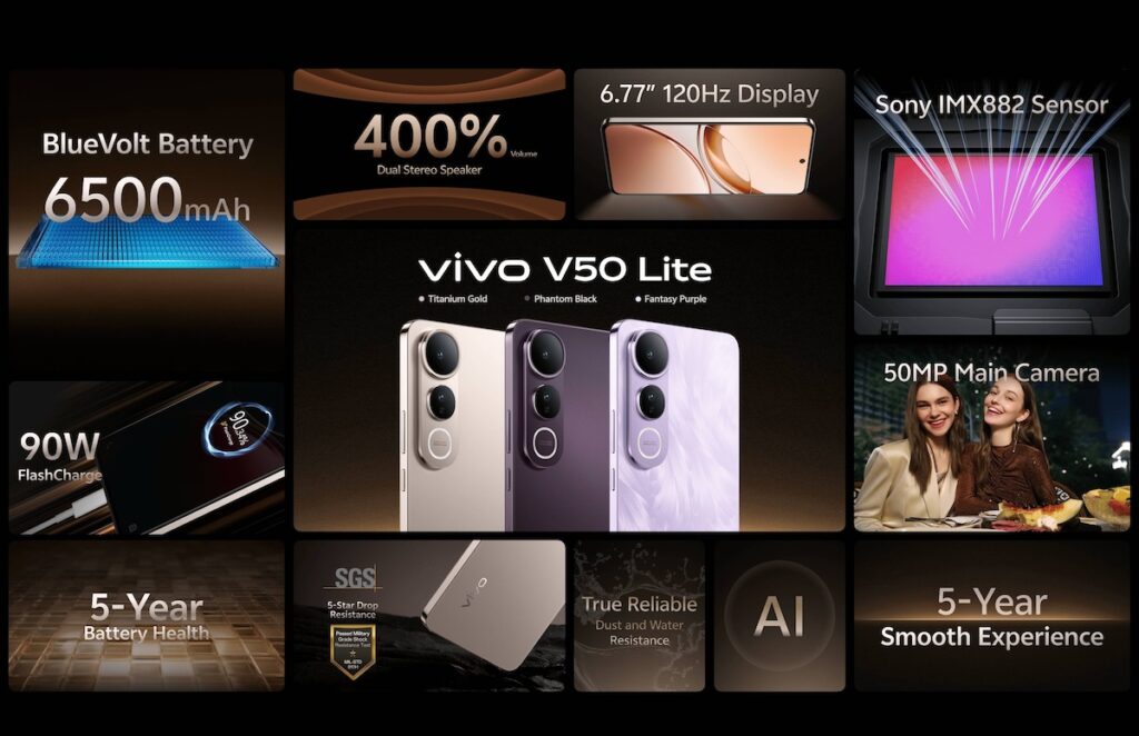 vivo ชูจุดเด่นของ V50 Lite ด้วยการอัปเกรดแบตเตอรี่ BlueVolt ความจุสูง 6500mAh ที่ได้รับการพัฒนาให้มีความทนทานเหนือระดับ มั่นใจด้วยการการันตีสุขภาพแบตเตอรี่ยาวนานถึง 5 ปีเต็ม มาพร้อมเทคโนโลยีชาร์จไว 90W FlashCharge เพื่อมอบประสบการณ์การใช้งานที่ทั้งอึดและชาร์จไวในเครื่องเดียว ตัวเครื่องโฉบเฉี่ยวและบางเบา จับถนัดมือตามแบบฉบับ V Series แต่เปี่ยมไปด้วยความแข็งแกร่งทนทานระดับ Military-Grade Certification รวมถึงผ่านการทดสอบการตกกระแทกระดับ 5 ดาวจาก SGS (Five-Star Drop Resistance) พิสูจน์แล้วว่าลุยได้ทุกสถานการณ์ พร้อมท้าให้ใช้งานเต็มประสิทธิภาพตลอดวัน