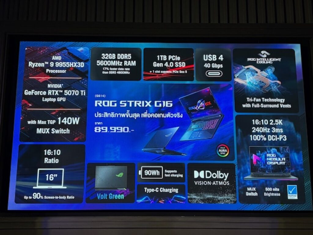 หน้าจอเพื่อการเล่นเกมอย่างแท้จริง อย่าง ROG Nebula Display แบบ IPS-level ขนาด 16 และ 18 นิ้ว ความละเอียด 2.5K อัตราส่วน 16:10 ความสว่างสูงสุด 500 nits แสดงผลภาพเคลื่อนไหวได้อย่างลื่นไหลด้วยอัตราการรีเฟรช 240Hz และครอบคลุม DCI-P3 100% มอบสีสันที่แม่นยำและคมชัดแม้ในฉากแอคชั่นสุดเข้มข้น ด้านเสียงที่จะมอบสัมผัสประสบการณ์ระดับ Hi-END 5.1.2 Channel ลำโพง 4 ตัว รองรับ Dolby Atmos เพื่อการรับชมคอนเทนต์อย่างเต็มอรรถรส โดย ROG Strix G16 (2025) มีราคาเริ่มต้นอยู่ที่ 89,990 บาท และ ROG Strix G18 (2025) มีราคาเริ่มต้นอยู่ที่ 99,990 บาท