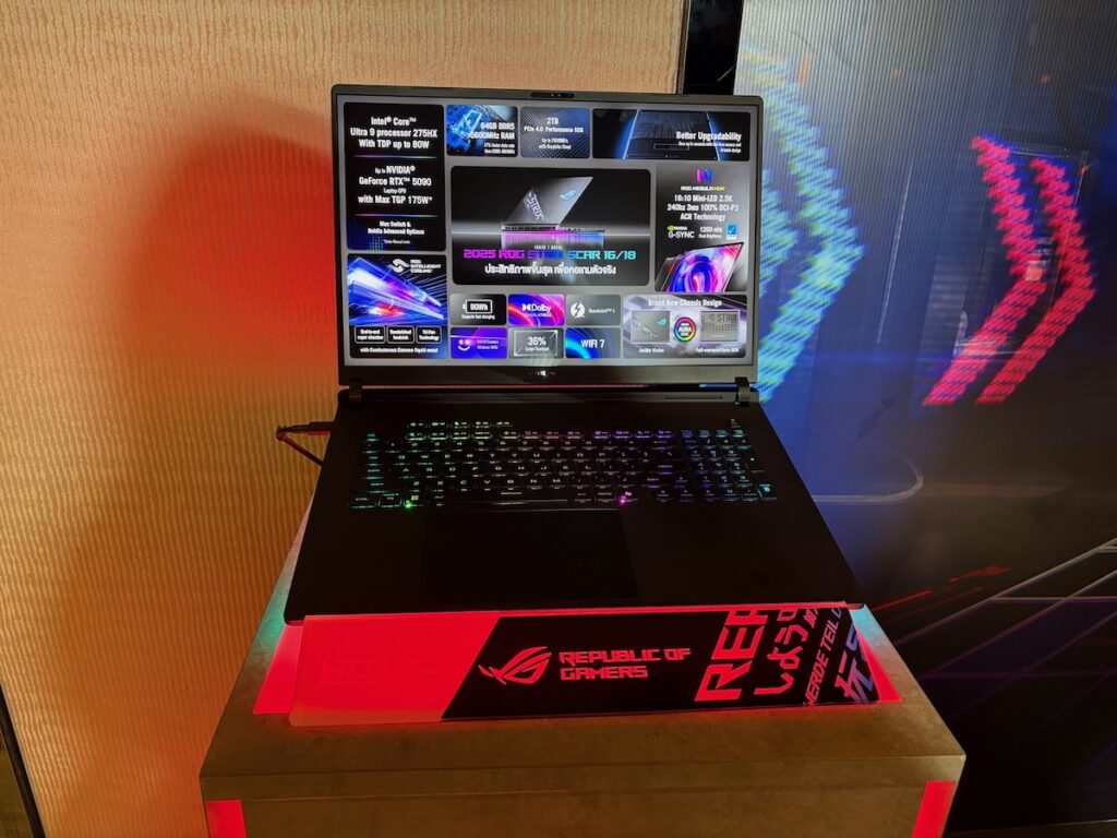 นอกจากนี้พอร์ตเชื่อมต่อยังรองรับ Thunderbolt 5 (USB-C) จำนวน 2 ช่อง ความเร็วสูงสุด 120Gbps และระบบเครือข่ายอินเตอร์เน็ต Wi-Fi 7 ซึ่งให้ความเร็วในการดาวน์โหลดเร็วกว่า Wi-Fi 6 ถึง 2.4 เท่า รวมทั้งกล้องความละเอียด 1080P FHD IR Camera สำหรับ Windows Hello มอบความปลอดภัยทางไซเบอร์ที่ดีขึ้นด้วยการจดจำใบหน้า โดย ROG Strix Scar 16 (2025) มีราคาเริ่มต้นอยู่ที่ 144,990 บาท และ ROG Strix Scar 18 (2025) มีราคาเริ่มต้นอยู่ที่ 149,990 บาท