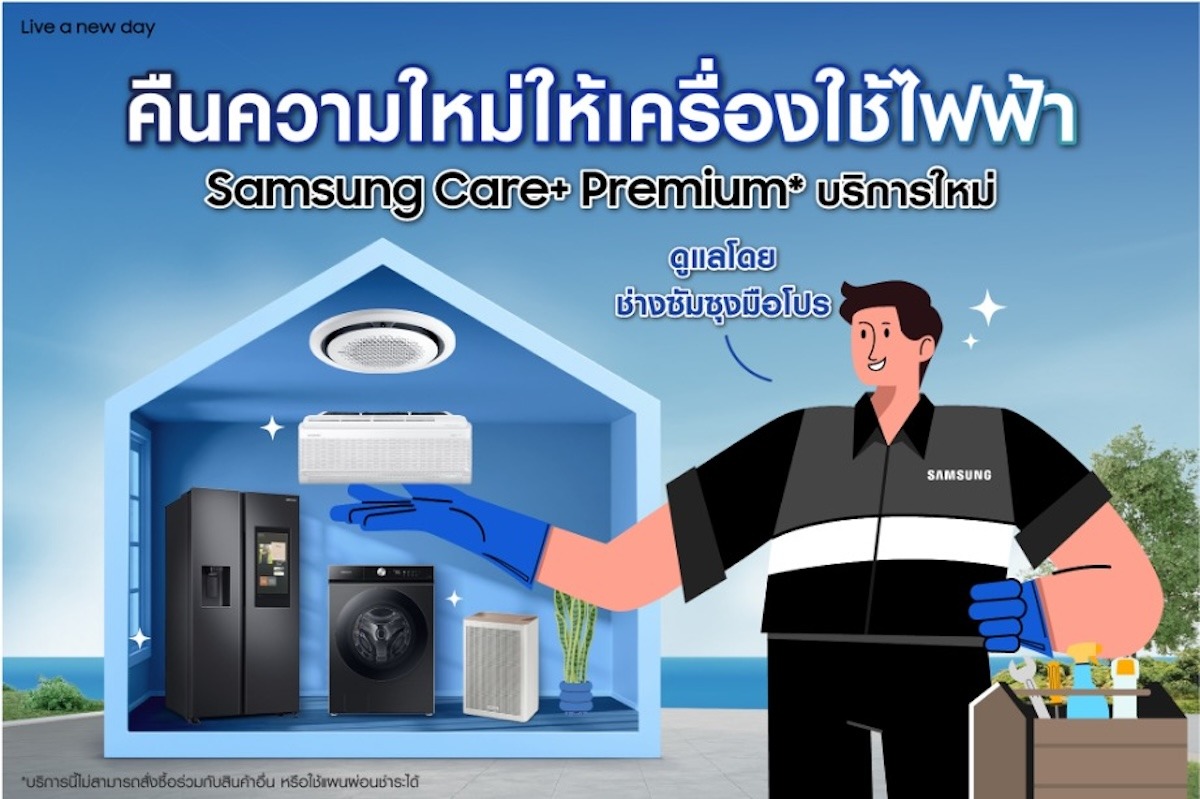 ซัมซุง พลิกโฉมมาตรฐานการดูแลเครื่องใช้ไฟฟ้า เปิดตัว “Samsung Care+ Premium” บริการดูแลเครื่องใช้ไฟฟ้าแบบ One-Stop Service ระดับพรีเมียมจากผู้เชี่ยวชาญตัวจริง รับบริการทีเดียวแต่ได้ครบทั้งตรวจเช็กสภาพเครื่องใช้ไฟฟ้า ล้างทำความสะอาด และเชื่อมต่อ SmartThings รายแรกในอุตสาหกรรม มีบริการครอบคลุมเครื่องใช้ไฟฟ้าทั้งเครื่องปรับอากาศ ตู้เย็น เครื่องซักผ้า เครื่องอบผ้า และเครื่องฟอกอากาศ ให้สะอาดเหมือนใหม่ ทำงานเต็มประสิทธิภาพสูงสุดและยืดอายุการใช้งานอย่างเหนือระดับโดยทีมงานมืออาชีพจากซัมซุงและพร้อมรับประกันคุณภาพหลังการบริการนานถึง 60 วัน
