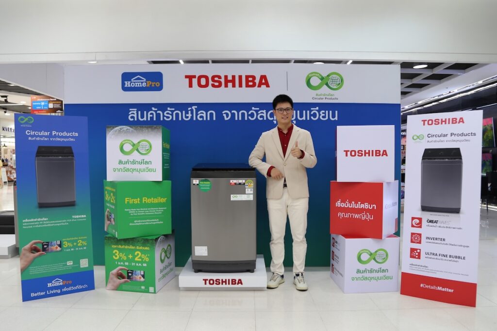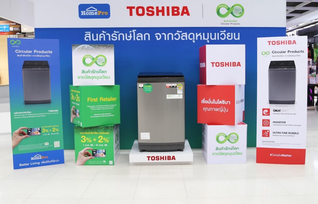 บริษัท โตชิบา ไทยแลนด์ จำกัด ผู้นำด้านเครื่องใช้ไฟฟ้าภายในบ้าน ผนึกกำลังกับบริษัท โฮม โปรดักส์ เซ็นเตอร์ จำกัด (มหาชน) ผู้นำธุรกิจค้าปลีกด้านวัสดุตกแต่งบ้านและเครื่องใช้ไฟฟ้าครบวงจร ประกาศความร่วมมือในการเปิดตัวเครื่องซักผ้าฝาบนรุ่นพิเศษ AW-DUM1600LT(SG) PCR ภายใต้โครงการ “HomePro Circular Products”