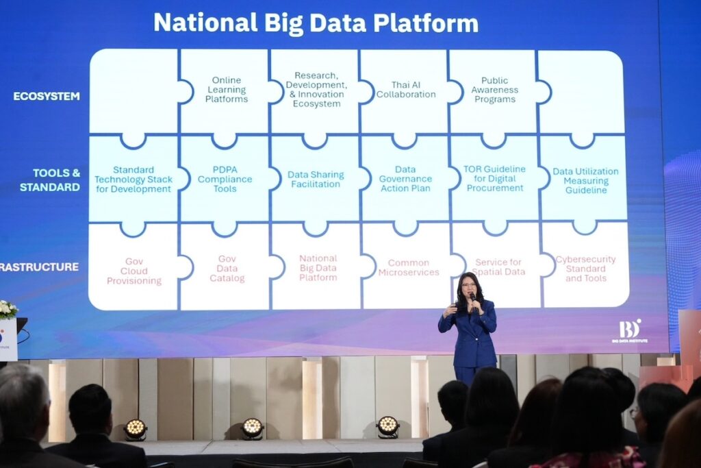 อีกหนึ่งภารกิจสำคัญ คือ การจัดตั้ง ‘National Data Bank’ ซึ่งรัฐบาลมุ่งหวังให้เป็นกลไกกลางในการรวบรวม จัดการ และเปิดใช้ข้อมูลขนาดใหญ่ของประเทศอย่างปลอดภัยและโปร่งใส โดยมี BDI กระทรวงดิจิทัลเพื่อเศรษฐกิจและสังคม(ดีอี) ร่วมกับ สำนักงานพัฒนาวิทยาศาสตร์และเทคโนโลยีแห่งชาติ กระทรวงการอุดมศึกษา วิทยาศาสตร์ วิจัยและนวัตกรรม ทำหน้าที่หลักในการออกแบบระบบและผลักดันการดำเนินงาน เพื่อให้ข้อมูลกลายเป็นรากฐานของการวางแผนเชิงนโยบาย การสร้างบริการสาธารณะ และการพัฒนานวัตกรรมที่ตอบโจทย์ของประเทศ