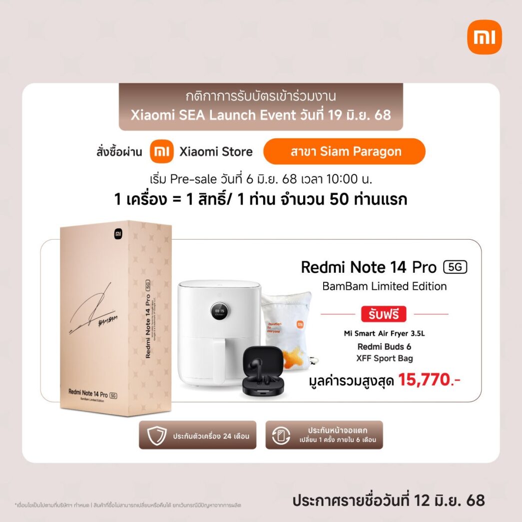 Redmi Note 14 Pro 5G BamBam Limited Edition พร้อมให้คุณเป็น 1 ใน 100 คนเพื่อเป็นเจ้าของก่อนใคร โดยสามารถสั่งซื้อล่วงหน้าในระหว่างวันที่ 6-11 มิถุนายน 25681 ในราคาพิเศษ 10,990 บาท (จากราคาปกติ 11,990 บาท) ผ่านช่องทางจำหน่ายที่ร้าน Xiaomi Store สาขาสยามพารากอน หรือช่องทางออนไลน์ mi.com เท่านั้น โดยลูกค้า 50 คนแรกที่สั่งซื้อสินค้าผ่านร้าน Xiaomi Store สาขาสยามพารากอน รับของสมนาคุณฟรี ได้แก่ หูฟัง Redmi Buds 6, หม้อทอดไร้น้ำมัน Mi Smart Air Fryer 3.5L และกระเป๋า XFF Sport Bag พร้อมรับประกันตัวเครื่อง 24 เดือน และประกันหน้าจอแตก (เปลี่ยน1 ครั้ง ภายใน 6 เดือน) รวมมูลค่า 15,770 บาท