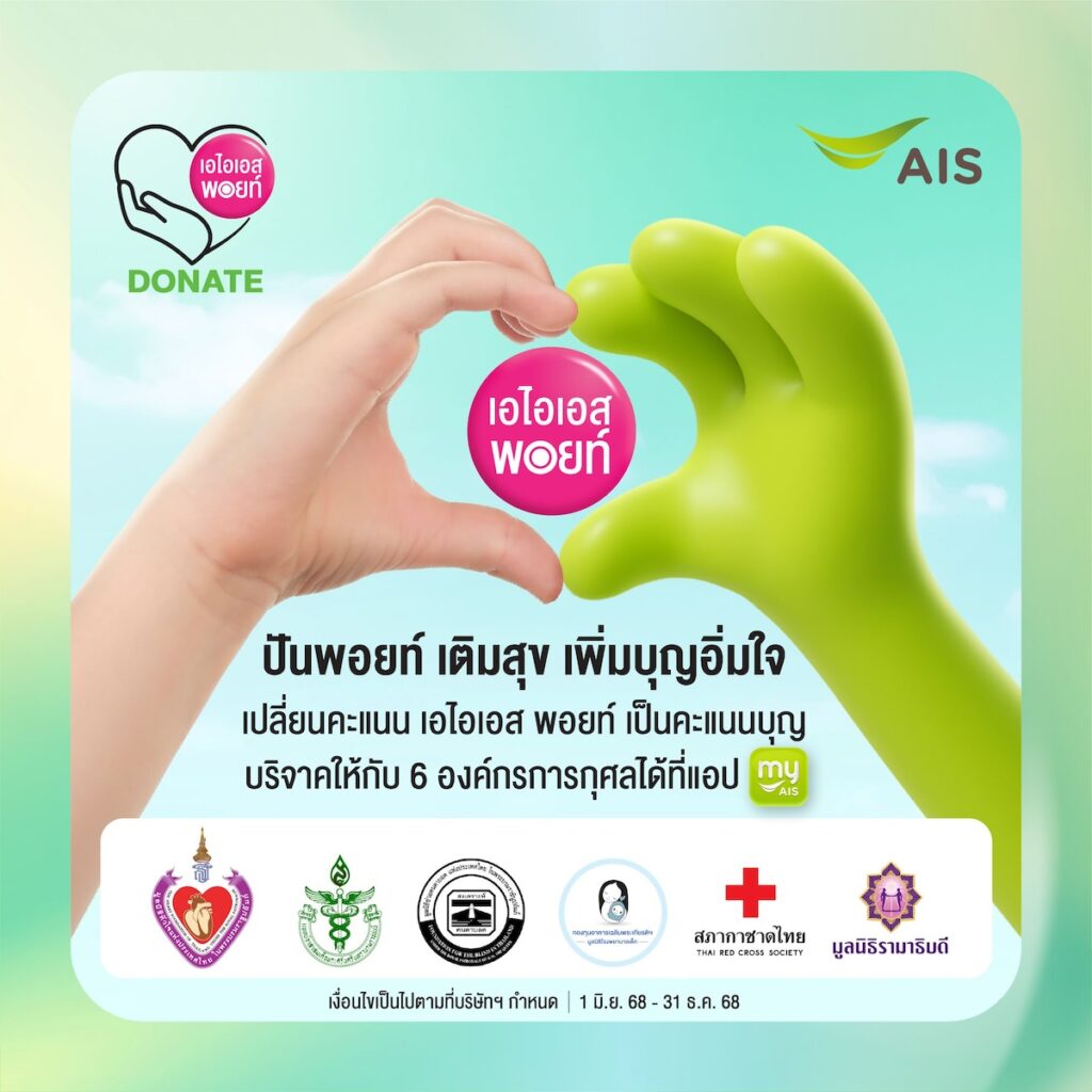 แลกบุญ – สร้างพลังแห่งการแบ่งปันกับกิจกรรม “ปันพอยท์ เติมสุข เพิ่มบุญอุ่นใจ” ตอบโจทย์กลุ่มลูกค้าที่ต้องการ “ให้” โดยการใช้ AIS Points บริจาคให้กับ 6 องค์กรการกุศลชั้นนำ ได้แก่ มูลนิธิหัวใจแห่งประเทศไทยในพระบรมราชูปถัมภ์ มูลนิธิแพทย์อาสาสมเด็จพระศรีนครินทราบรมราชชนนี มูลนิธิช่วยคนตาบอดแห่งประเทศไทยในพระบรมราชินูปถัมภ์ มูลนิธิโรงพยาบาลเด็กกองทุนอาคารเฉลิมพระเกียรติฯ สภากาชาดไทย และมูลนิธิรามาธิบดีได้โดยตรงผ่านแอป myAIS ตั้งแต่วันนี้ – 31 ธันวาคม 2568 โดยสามารถเลือกบริจาคได้ตั้งแต่ 100, 200 หรือ 300 คะแนนต่อครั้ง