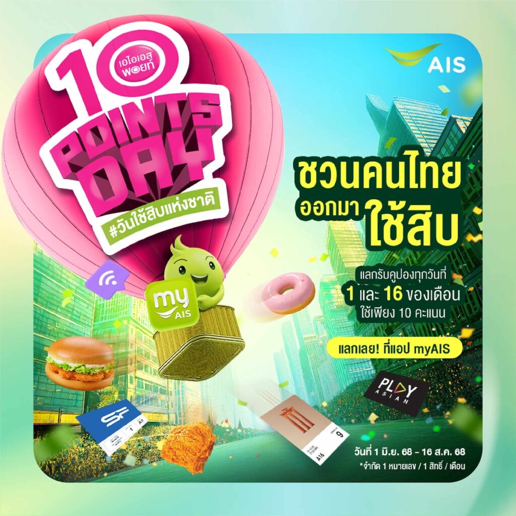 ลองใช้ – เปิดโอกาสให้ลูกค้าเริ่มต้นใช้ AIS Points ได้ง่ายๆ ผ่านกิจกรรม “10 Points Day – วันใช้สิบแห่งชาติ” ทุกวันที่ 1 และ 16 ของเดือน กับสิทธิพิเศษจากร้านค้าชั้นนำ ไม่ว่าจะเป็นคูปองอาหาร ขนม เครื่องดื่ม ตั๋วหนัง หรืออินเทอร์เน็ต เพียงใช้แค่ 10 คะแนน ก็สามารถแลกรับได้ทันที เพื่อกระตุ้นการเริ่มต้นใช้งาน ลดการปล่อยให้คะแนนหมดอายุโดยเปล่าประโยชน์ พร้อมเปลี่ยนคะแนนสะสมให้กลายเป็นประสบการณ์ที่จับต้องได้ ตั้งแต่วันนี้ – 16 สิงหาคม 2568 ชวนให้ทุกคนมาใช้ผ่านแคมเปญกระตุ้นแลกพอยท์ วันใช้สิบแห่งชาติ