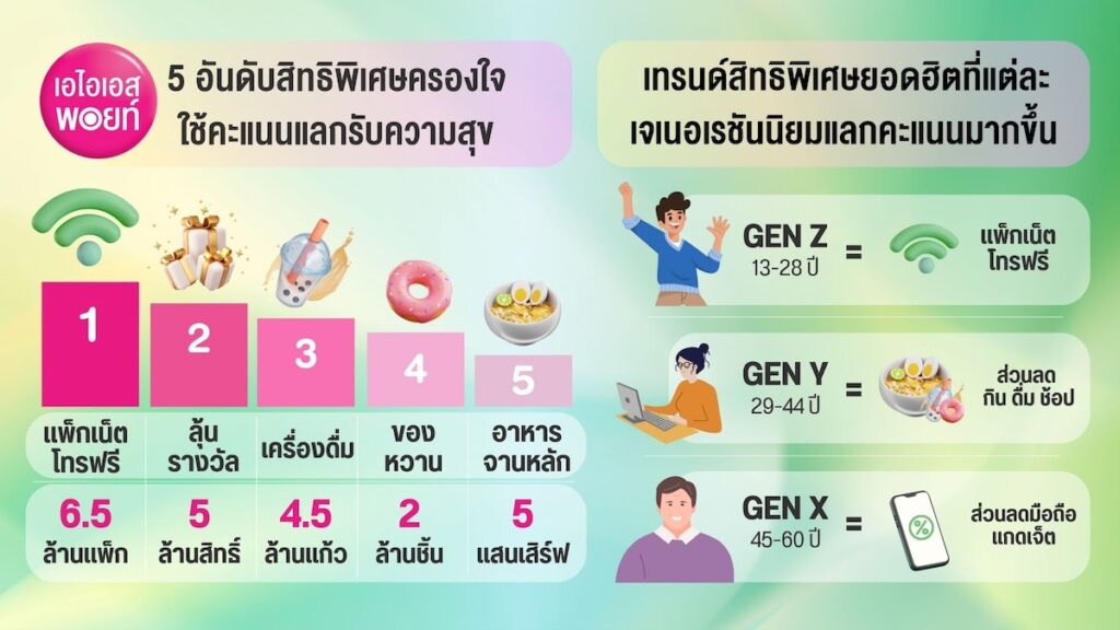 กลุ่ม Gen X (อายุ 45-60 ปี)มีอัตราการแลกคะแนนเพื่อรับส่วนลดมือถือและอุปกรณ์เสริมเติบโตสูงที่สุด สะท้อนความสนใจในการอัปเกรดอุปกรณ์ให้ทันสมัยอยู่เสมอ กลุ่ม Gen Y (อายุ 29-44 ปี)ใช้คะแนนแลกส่วนลดกิน ดื่ม เที่ยว และช้อปปิ้ง เป็นหลัก ซึ่งสอดคล้องกับไลฟ์สไตล์ที่เน้นการใช้ชีวิตอย่างคุ้มค่า ขณะที่กลุ่ม Gen Z(อายุ 13-28 ปี)มีอัตราการแลกคะแนนเพื่อรับแพ็กเกจอินเทอร์เน็ตและโทรฟรีเพิ่มขึ้นสูงสุด สะท้อนถึงความต้องการในการเชื่อมต่อโลกดิจิทัลตลอดเวลา ดังนั้น เพื่อตอบโจทย์ความต้องการของลูกค้าทุกกลุ่มอย่างตรงใจและครบครันที่สุด จึงเป็นที่มาของการยกระดับ AIS Points ด้วยกลยุทธ์ “ทุกพอยท์ มีพลัง” ที่ออกแบบมาเพื่อรองรับไลฟ์สไตล์ที่หลากหลาย เติมเต็มทุกการใช้คะแนนให้มีคุณค่ายิ่งขึ้นในทุกมิติ